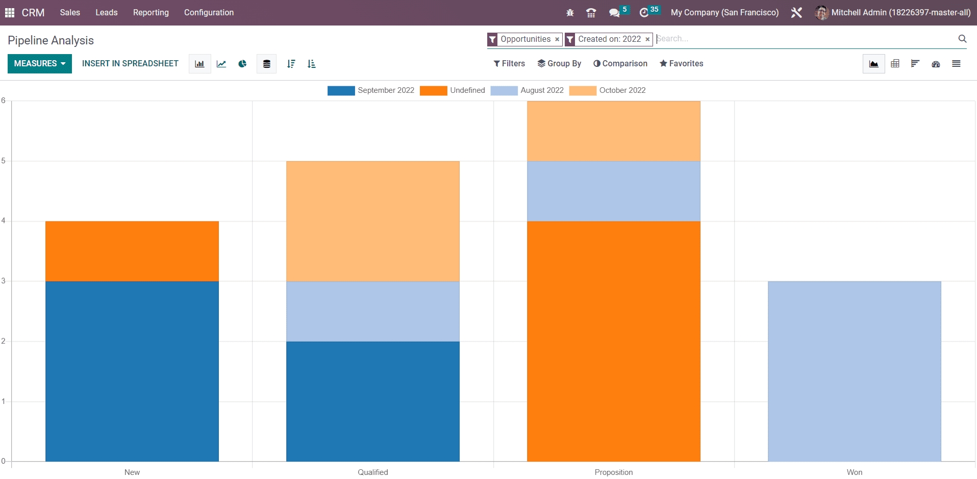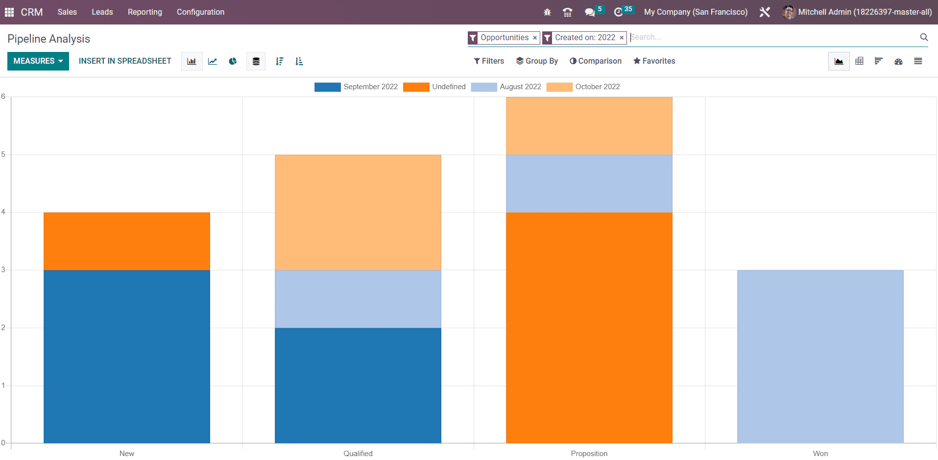 The analysis of all pipeline activities can be observed using the Pipeline Analysis option available under the Reporting menu of the Odoo CRM module.