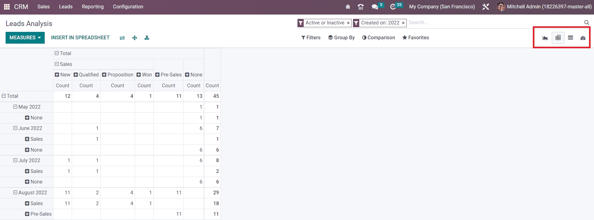 This platform can be viewed in Kanban, Graph, Pivot, and List views. Using suitable measures, groups, and filters, you can improve the forecast reports.