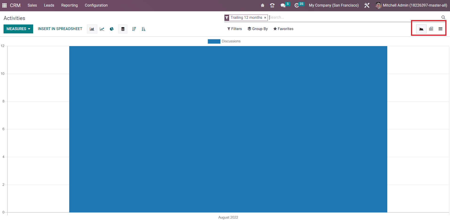 The Activities option in the Reporting menu will help you to get the reports of all scheduled as well as completed activities in the Odoo CRM module.