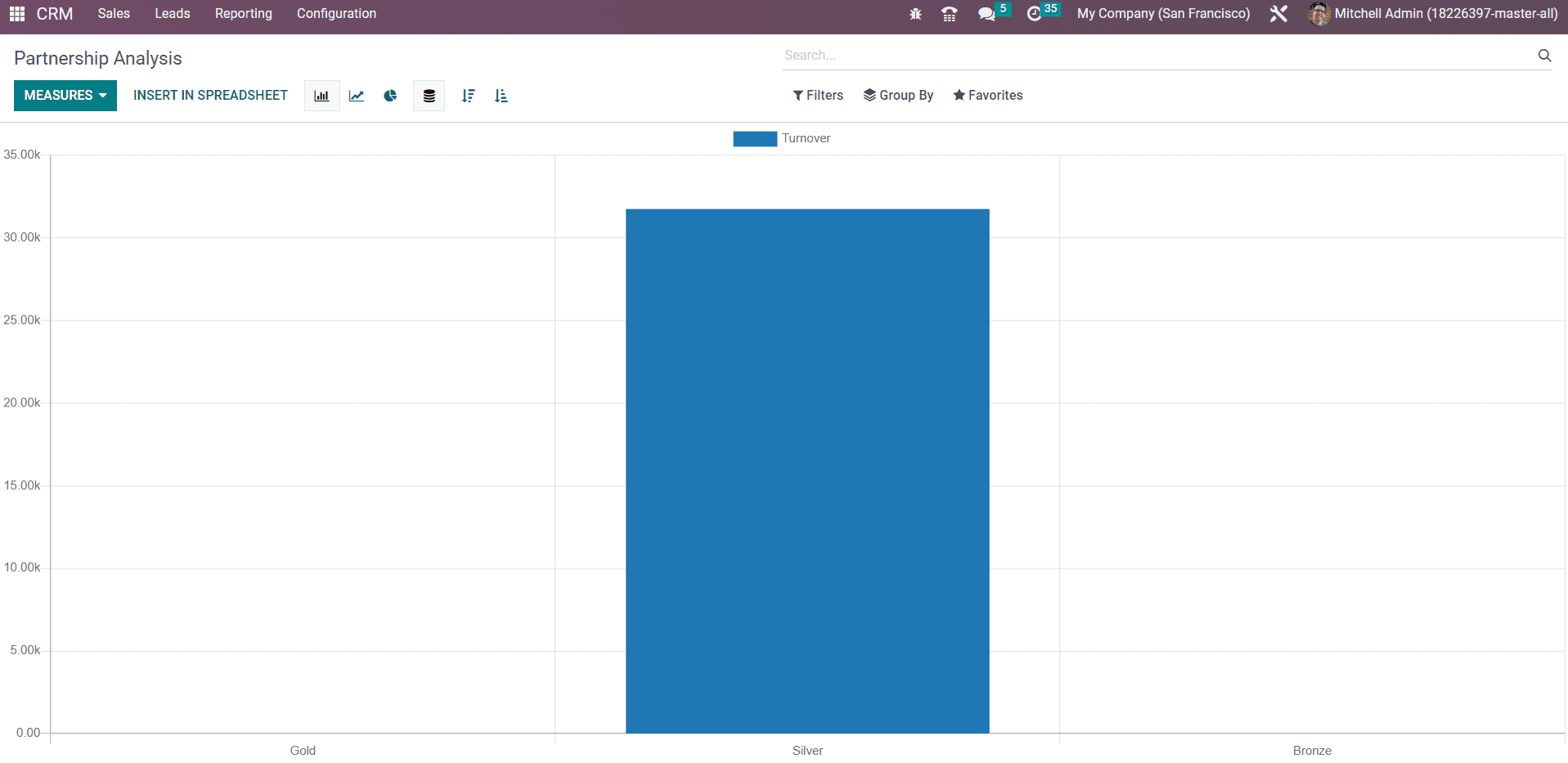 The Partnerships Analysis platform available under the Reporting menu will display the graphical representation of the financial turnover with your partner. You can also generate reports of the opportunities generated with the help of partners using the corresponding option from the Measures .