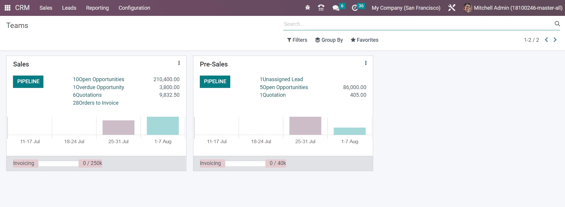 As you can see in the image above, you will get separate tabs for all configured sales teams in the CRM module. From the preview itself, you can see the total number of opportunities, quotations, and orders to invoice and the respective expected revenues. By clicking on the Pipeline button, Odoo will direct you to the pipeline of the corresponding sales team.