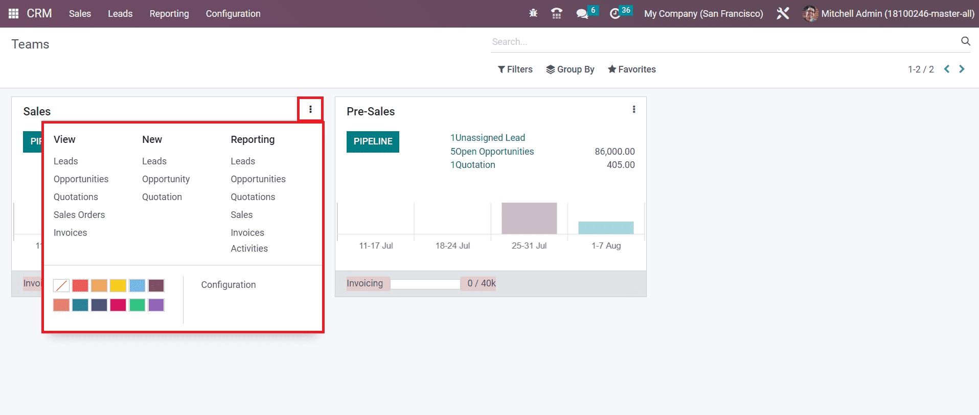 By clicking on the three vertical dots given in the right corner of each sales team tab, you will get additional options to manage the respective sales team. There are options to view Leads, Opportunities, Quotations, Sales Orders, and Invoices assigned for that particular team. Under the New option, the members of the sales team will get options to create new Leads, Opportunities, and Quotations. The advanced Reporting menu available on each sales team will show the reports of the Leads, Opportunities, Quotations, Sales, Invoices, and Activities of the respective team. Apart from these options, you will also be able to get a Configuration button which will help you to make changes in the respective sales team.
