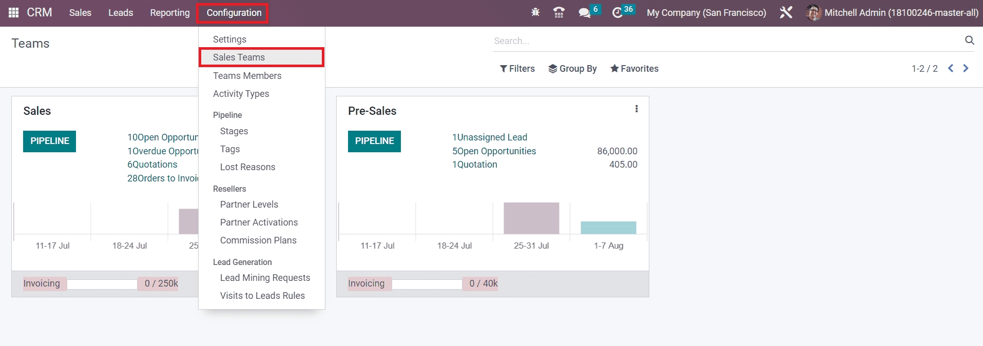 Under the Sales menu of the CRM module, you can find the Sales Teams option which gives access to the platform where all sales teams are managed. For the effective management of leads, opportunities, and other CRM-related operations, it is very essential to assign sales teams.