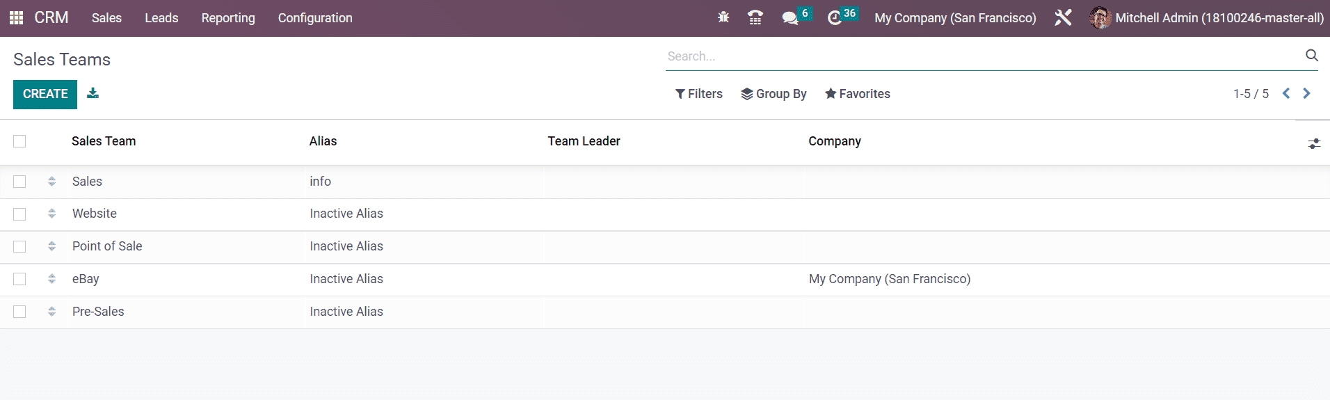 To create and manage new sales teams in the Odoo CRM module, you will get the Sales Teams option in the Configuration menu of the module as shown in the image above. The list of the already configured sales teams can be observed on this platform with the details of the Name of the Sales Team, Alias, Team Leader, and Company.