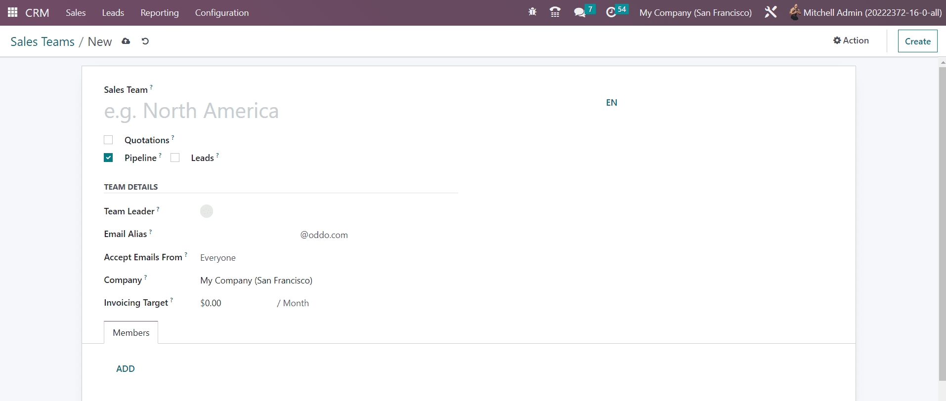 In the sales team creation window, you can specify the required details to create a sales team. Will discuss the configuration of the sales team in Odoo in detail in the Sales module chapter.