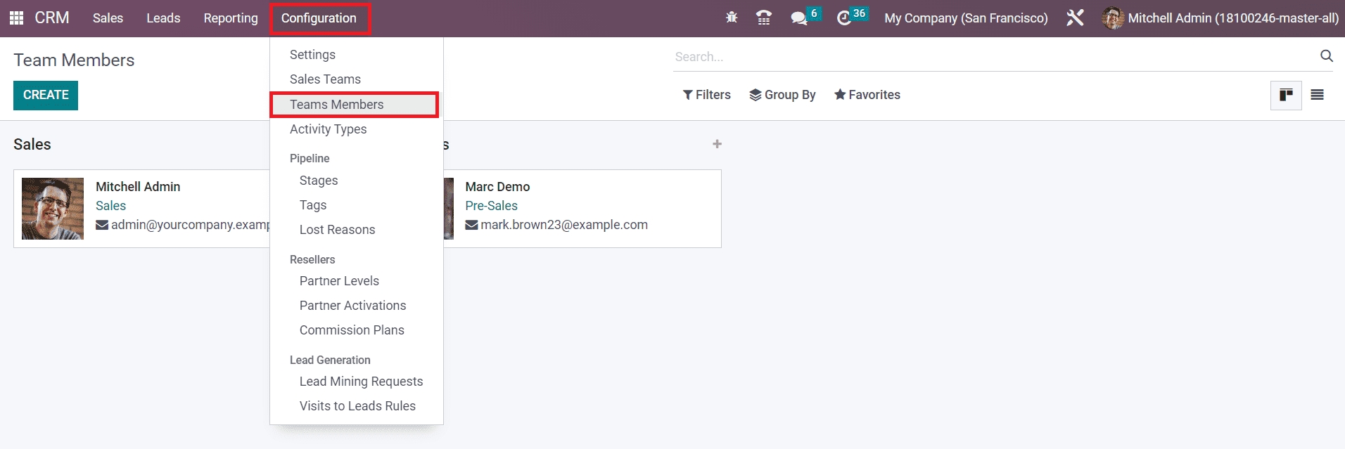 The list of the team members included in each sales team can be observed separately using the Team Members option available under the Configuration window. As you can see in the image below, the list of team members can be seen under the respective sales teams.