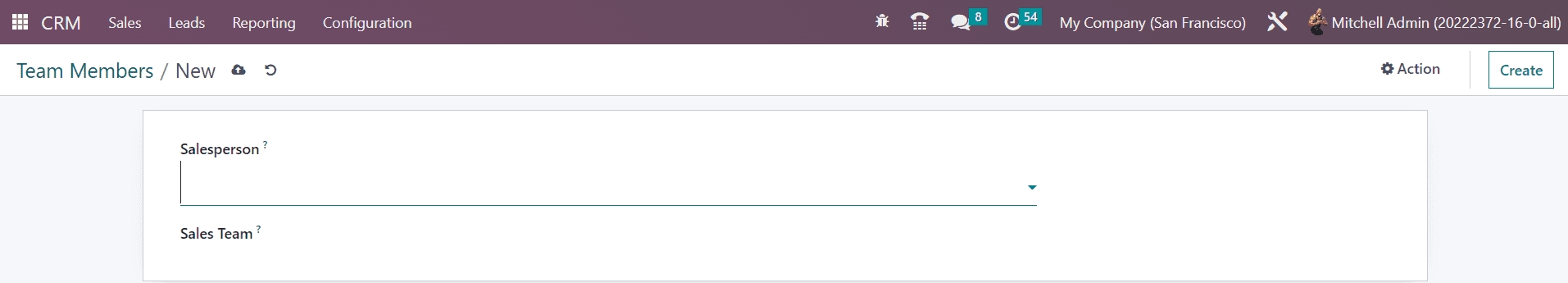 It is easy to create new team members on this platform. For this, you can click on the Create button. A window will appear as shown below to mention the Salesperson .