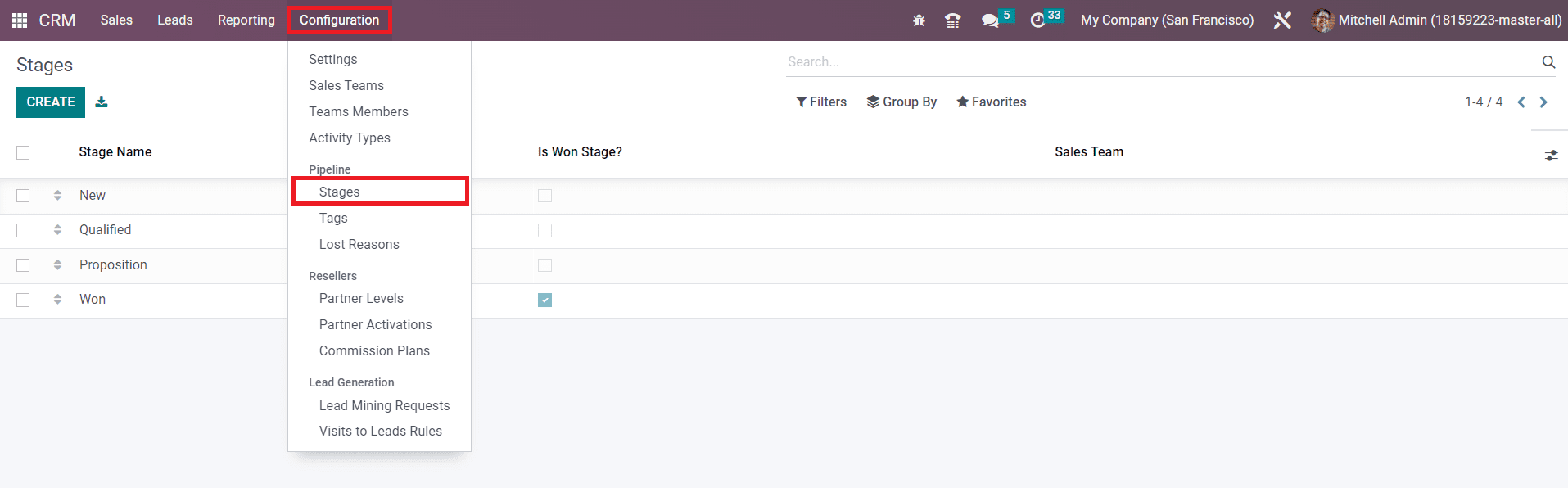 The list of already configured stages can be seen in this window as shown in the image above. You can make changes in the existing stages by simply clicking on the required stage from the given list. If you want to create a new stage for the leads/opportunities in your pipeline, you can click on the Create button given in the top left corner of the screen.