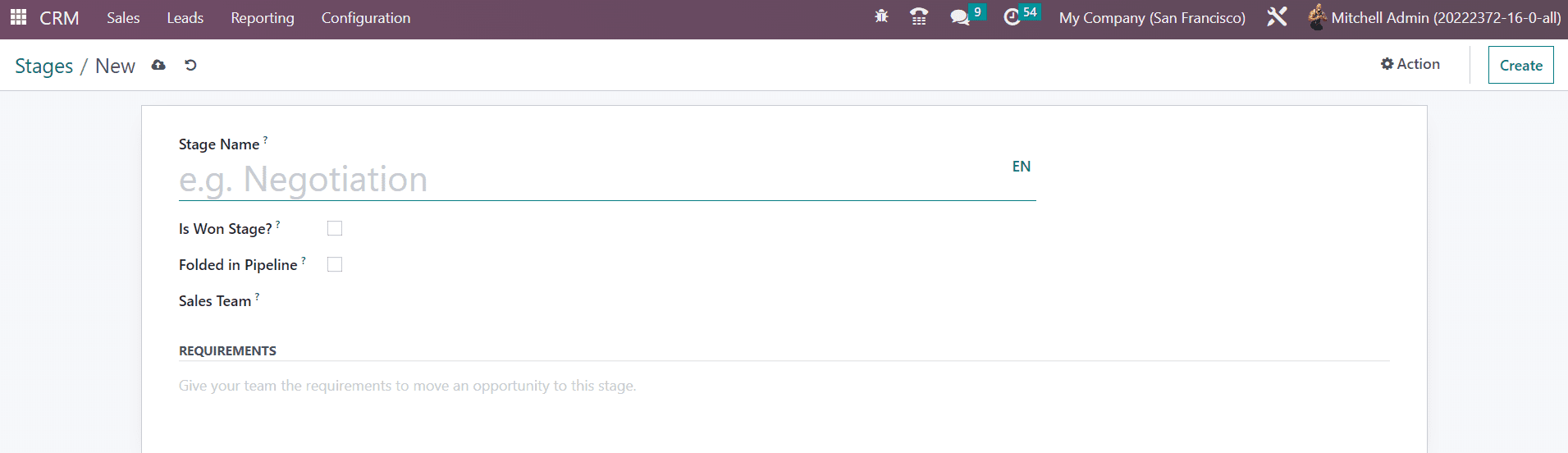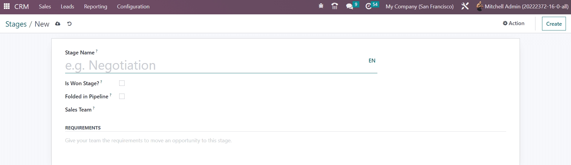 Give a suitable title for the stage in the Stage Name field. You can activate the Is Won Stage if you want to consider this particular stage as the won stage for the leads/opportunities. It is possible to fold this stage in the pipeline by activating the Folded in Pipeline option. You can mention specific teams that use this stage in the Sales Team field. By mentioning this, other teams will not be able to see or use this particular stage. Finally, you can specify some requirements in the Requirements field to move a lead/opportunity to this stage. Once you complete all necessary fields, the new stage will be added to the existing list of stages.