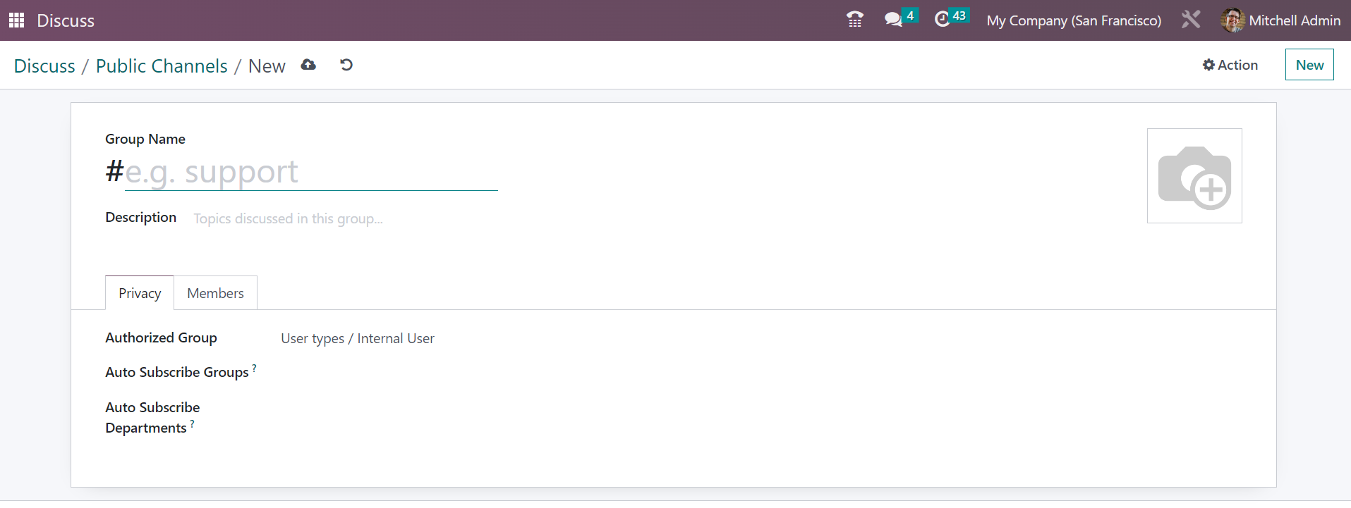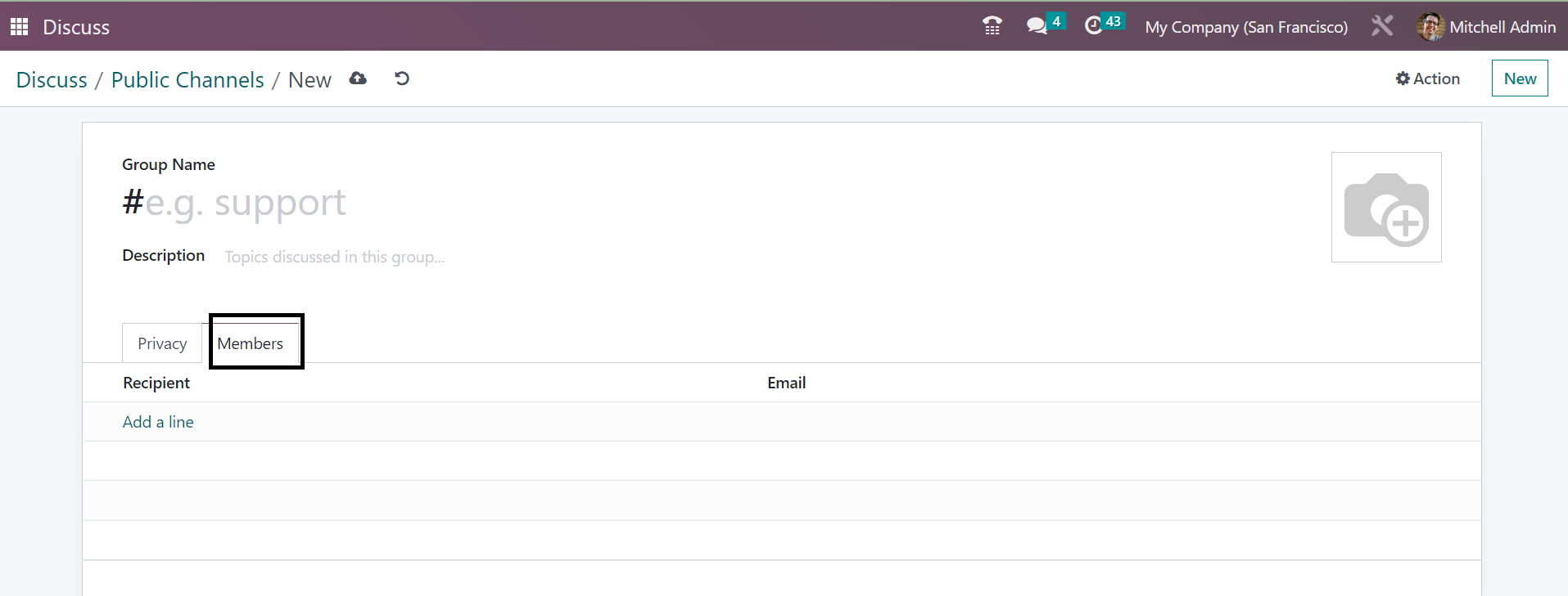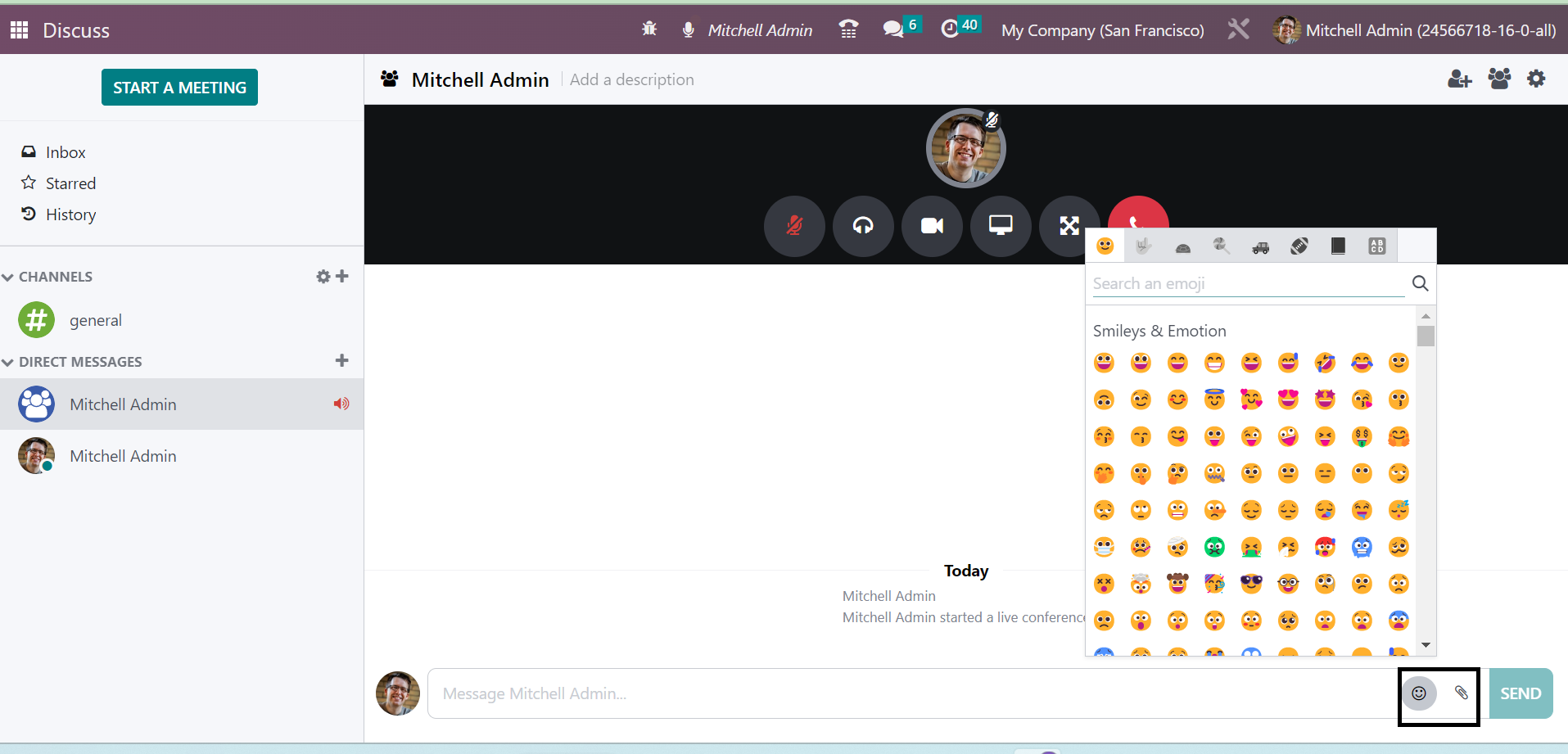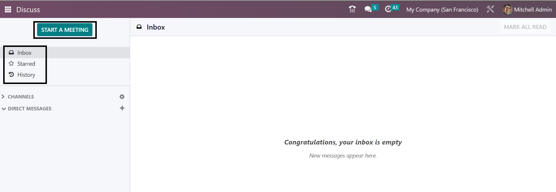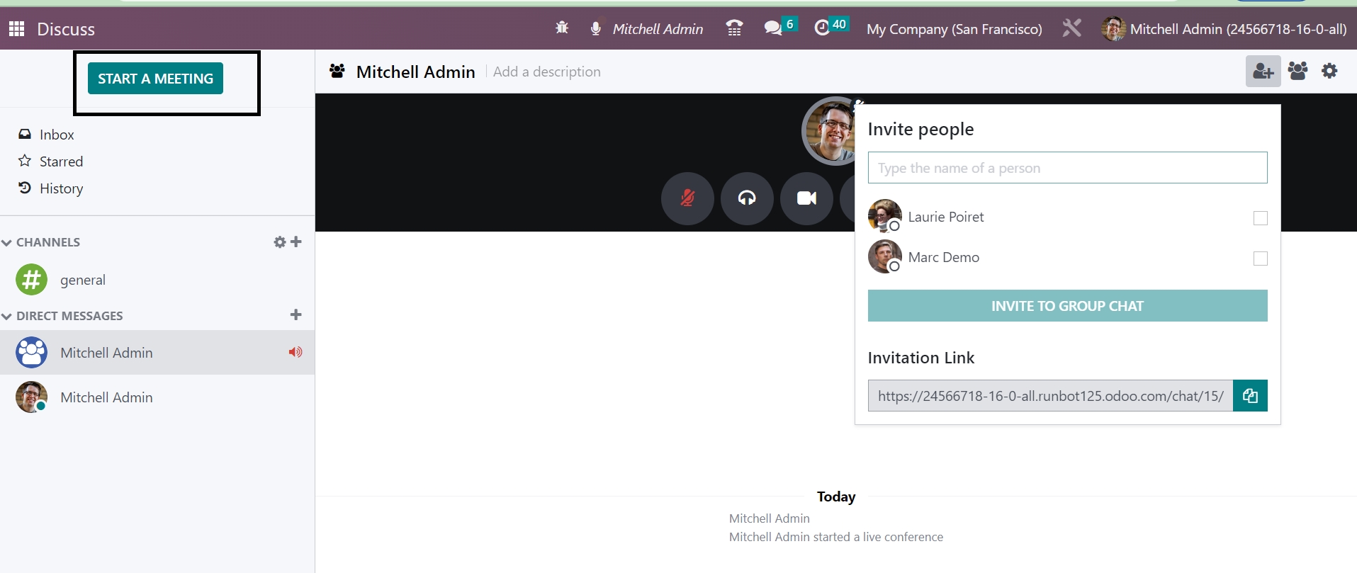 Without going to the Discuss module, you can easily regulate the new messages that have been received to the user. The messages can be easily sent and received by these methods of integrating with other modules. You can easily begin a meeting without opening the Discuss module itself. The New Message option provided in the page helps you to begin the meeting. On selecting the option, you will get the meeting space, as shown below.