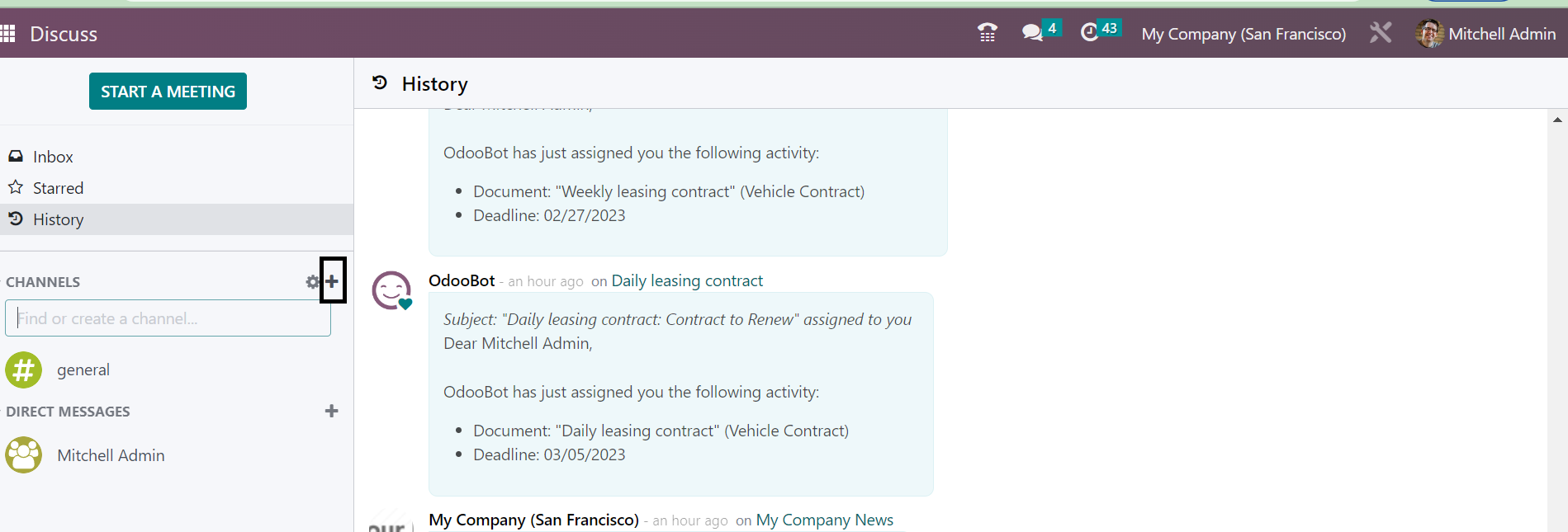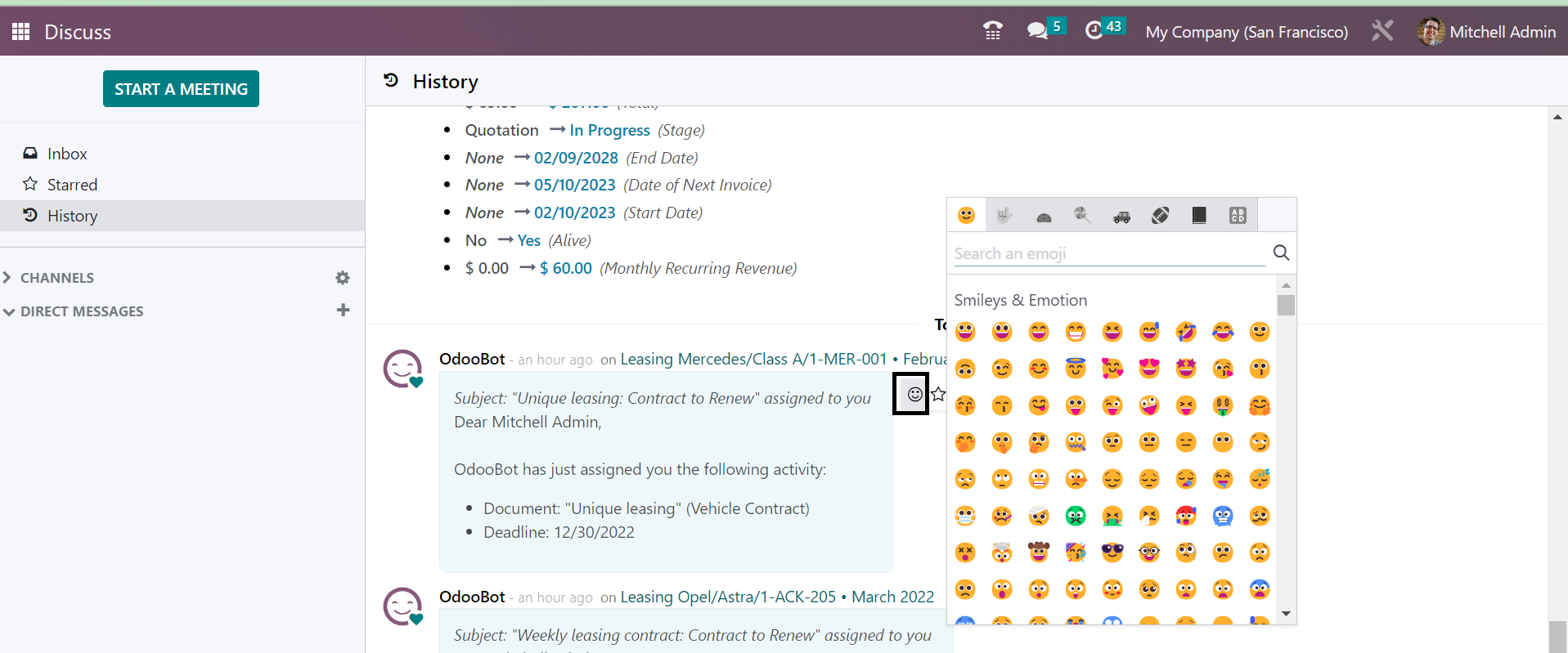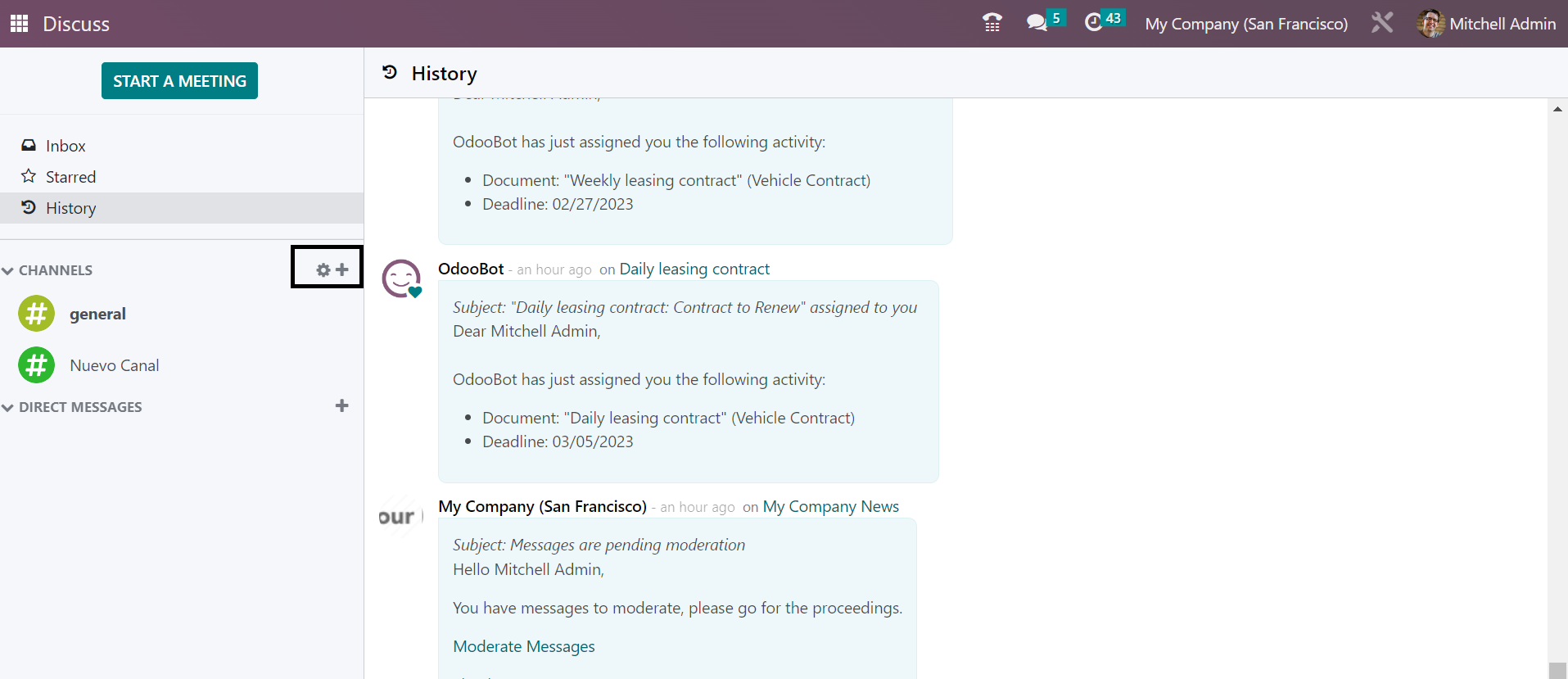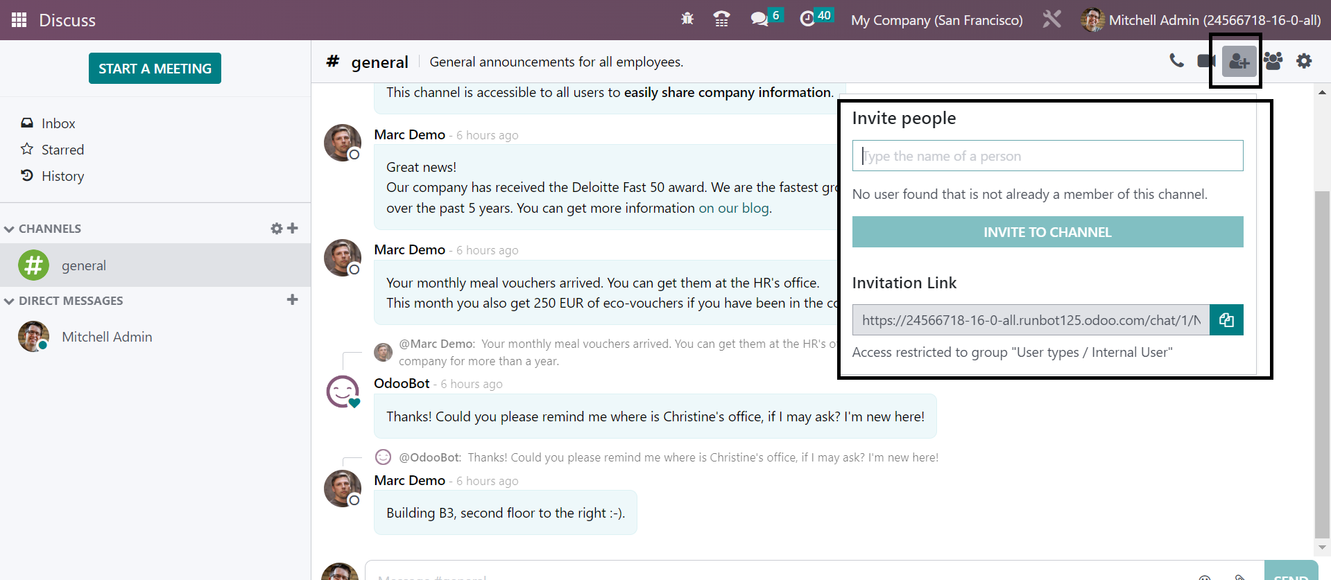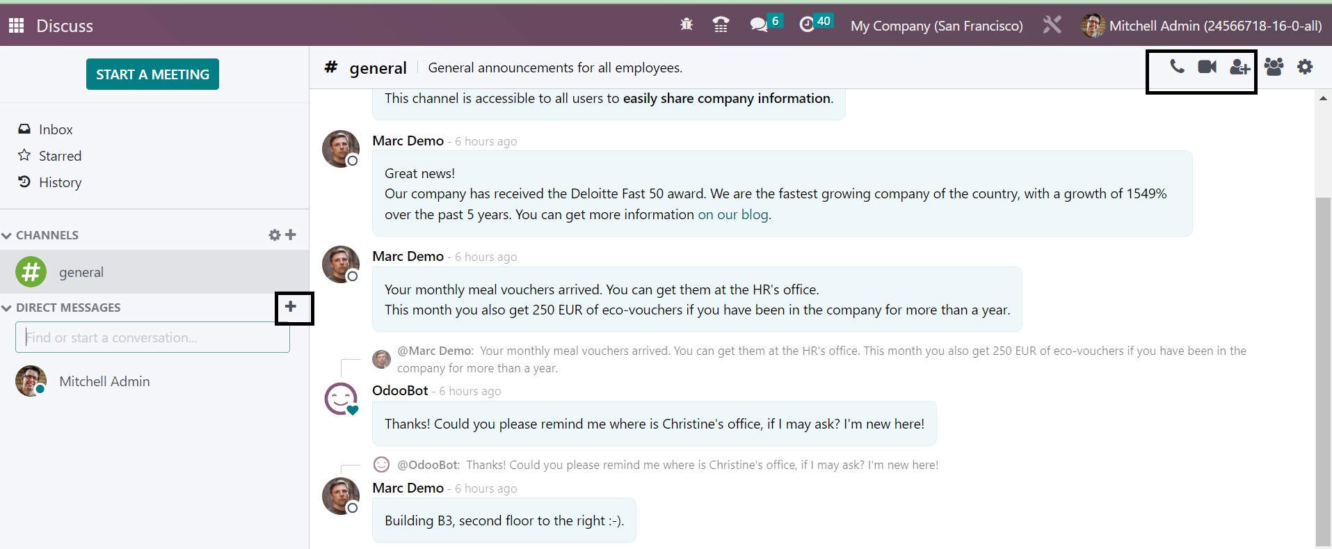 Without going to the Discuss module, you can easily regulate the new messages that have been received to the user. The messages can be easily sent and received by these methods of integrating with other modules. You can easily begin a meeting without opening the Discuss module itself. The New Message option provided in the page helps you to begin the meeting. On selecting the option, you will get the meeting space, as shown below.