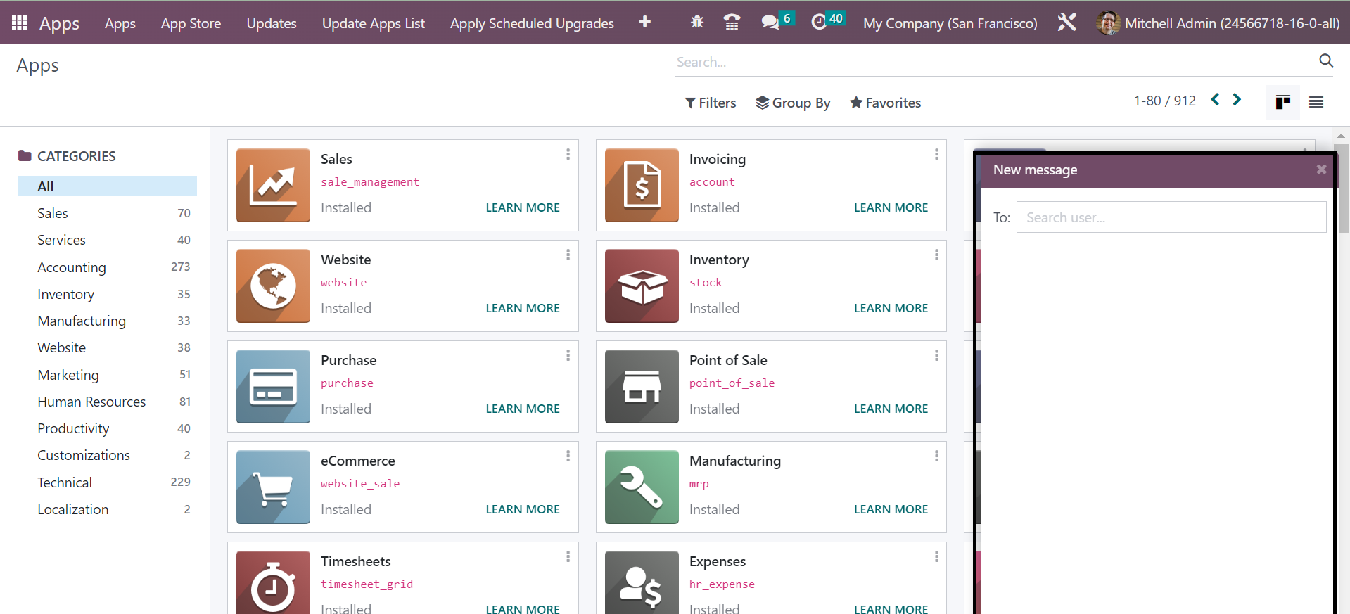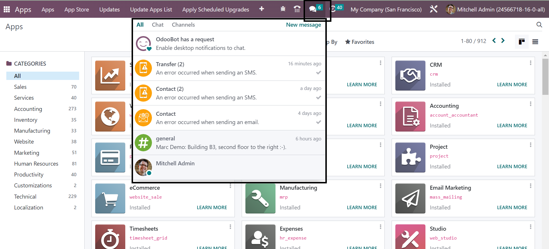 Using the icons marked in the above screenshot, you can easily invite the people to the chat room. The chat can be controlled and regulated from any place in the Odoo software. The notification regarding the messages will be visible from any of the spaces in the Odoo. You can go to the Apps option in the filter and see the chats there.