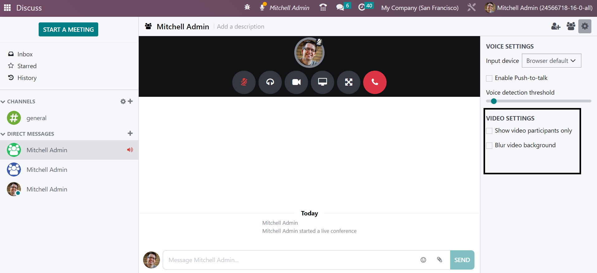 On starting a video conference during a meeting, you will get some options in the settings, such as Show video participants only and Blur video background as well. The options can be triggered if required. You will get input device and browser default options. Under the Input device, you can activate the push-to-talk option if required. These are all the features available in the Discuss module in Odoo ERP Software.