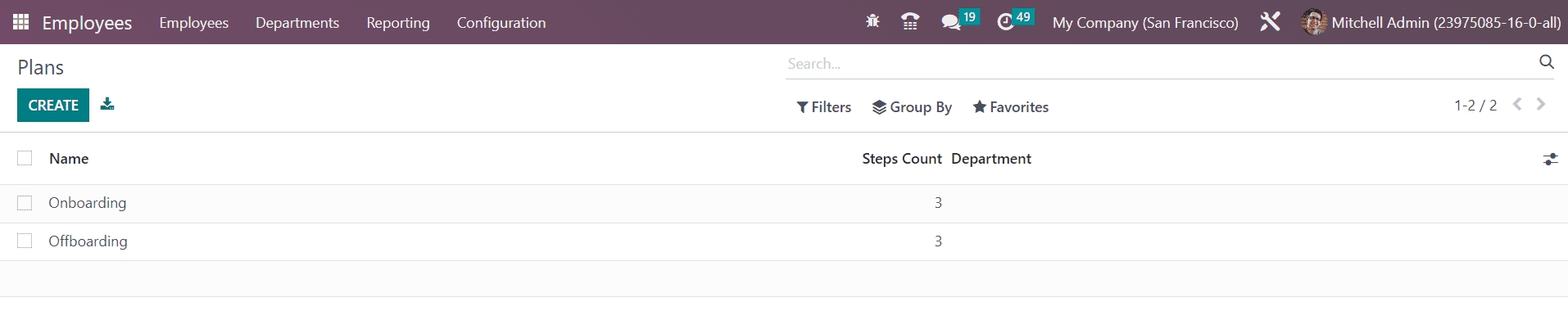 The Activity Planning option can be found in the Configuration menu of the Employee module. This option can be used for configuring various activity plans for the employees, just like onboarding and offboarding activities in a company. The Plans window will show the list of already configured plans as shown below.