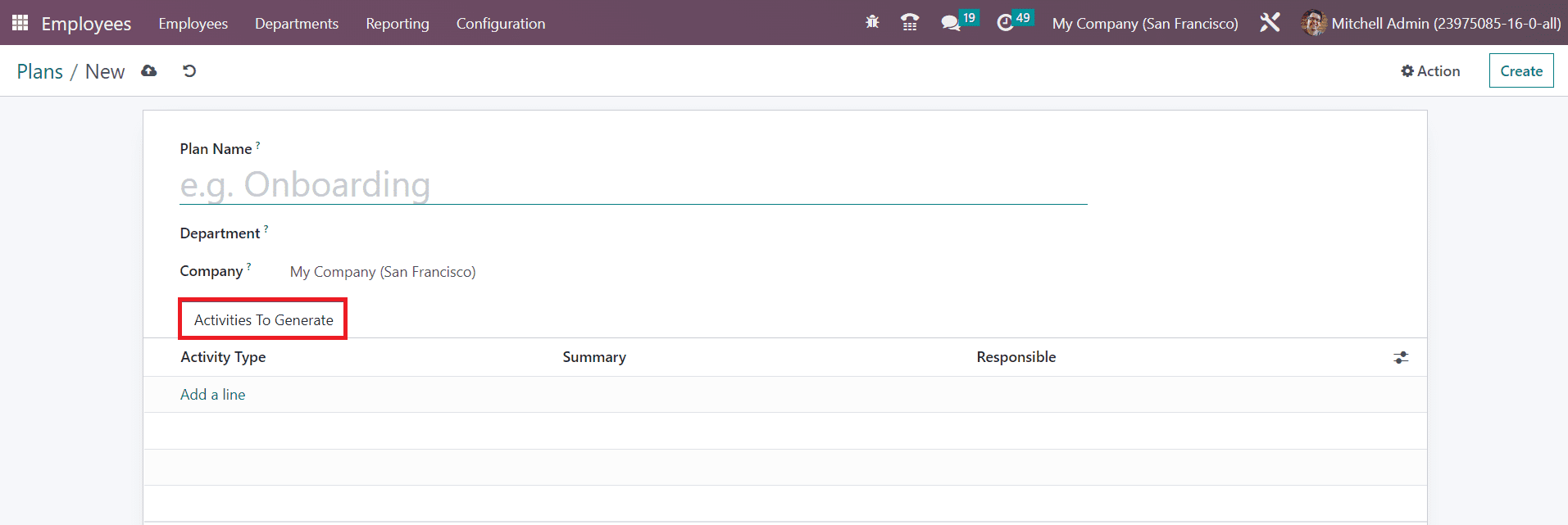 After mentioning the Plan Name, you can specify the Department and Company in the respective fields. Under the Activities To Generate tab, you can add activities using the Add a Line button.