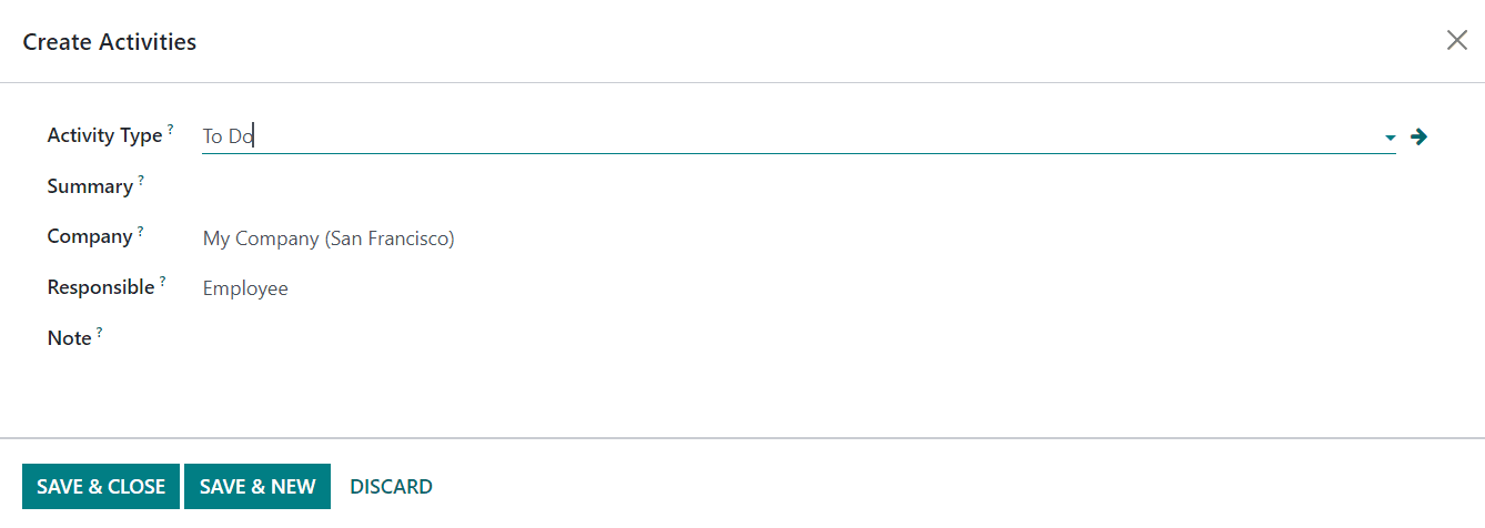 Here, you will get a pop-up window as shown above. Mention the Activity Type, Summary, Company, Responsible, and Note related to the activity in the corresponding fields. After adding the required activities to the plan, the new plan will be saved in your database.