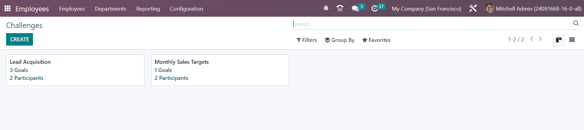 For qualifying badges, you can set certain challenges for the employees in the Odoo Employees module. Once the employee completes the challenge, you can grant suitable badges for them. In order to configure such challenges for your employees, you can go to the Configuration menu of the module, where you can find the Challenges option. Clicking on this option will direct you to the window with the details of the already configured challenges, as shown in the image below.
