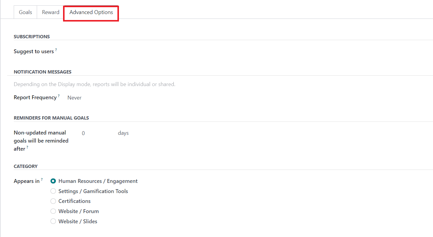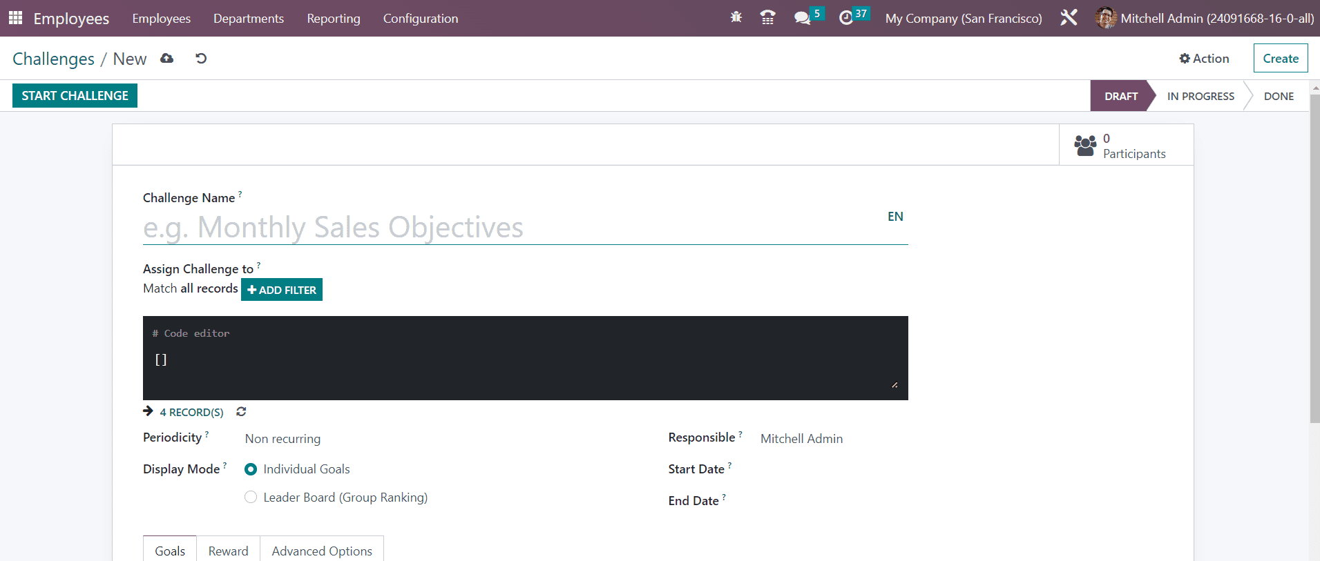 Here, you will get a specified field to mention the Challenge Name. Using the Add Filter option, you can set users so that Odoo can assign challenges to the matching records. The period of automatic challenge assignation can be defined in the Periodicity field. It can be Daily, Weekly, Monthly, or Yearly. You can also set it as Non-Recurring if you don’t want to repeat the challenge. The Display Mode can be set as Individual Goals or Leader Boards. The employee who is in charge of the management of this challenge can be specified in the Responsible field. The duration of the challenge can be added in the Start and End date fields.