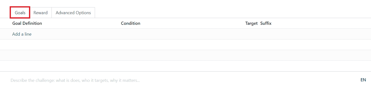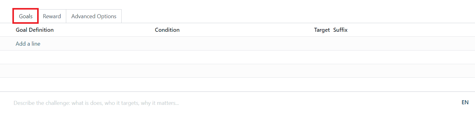 You can explain the challenge under the Goals tab using the Add a Line button. It will help a user to understand the conditions of the challenge. It includes Goal Definition, Condition, Target, and Suffix.