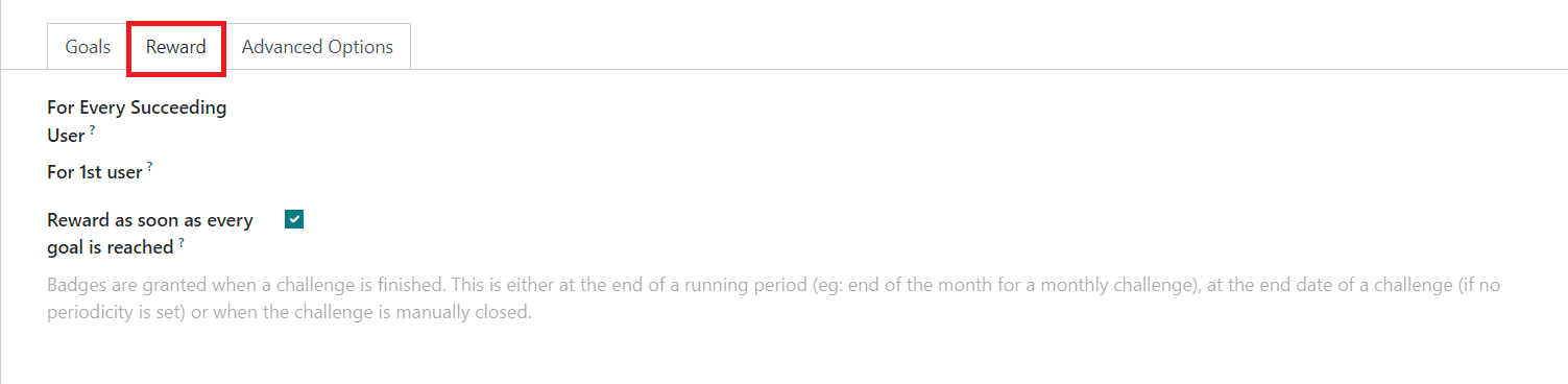 Under the Reward tab, you can add the rewards for the challenges. You can set rewards for Every Succeeding User and For 1st User. If you want to reward the employee as soon as the goal is completed, you can activate the Reward as soon as every goal is reached.