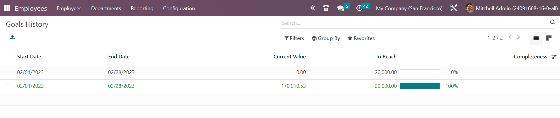 In order to examine the performance of the employees, you can go to the Configuration menu and select the Goal History option. This window will display the goal history of the employees.