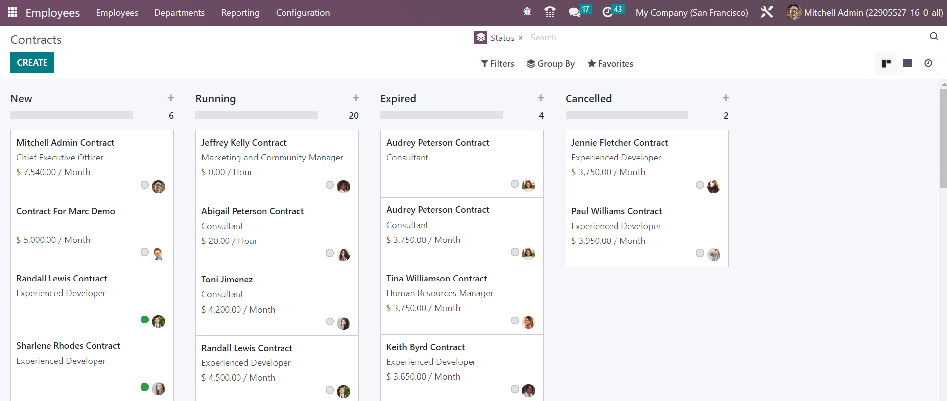 You can select the All Contract menu available in the Odoo Employees module to observe the contracts configured for different employees in the company. The Kanban view of the all contracts platform is given below.