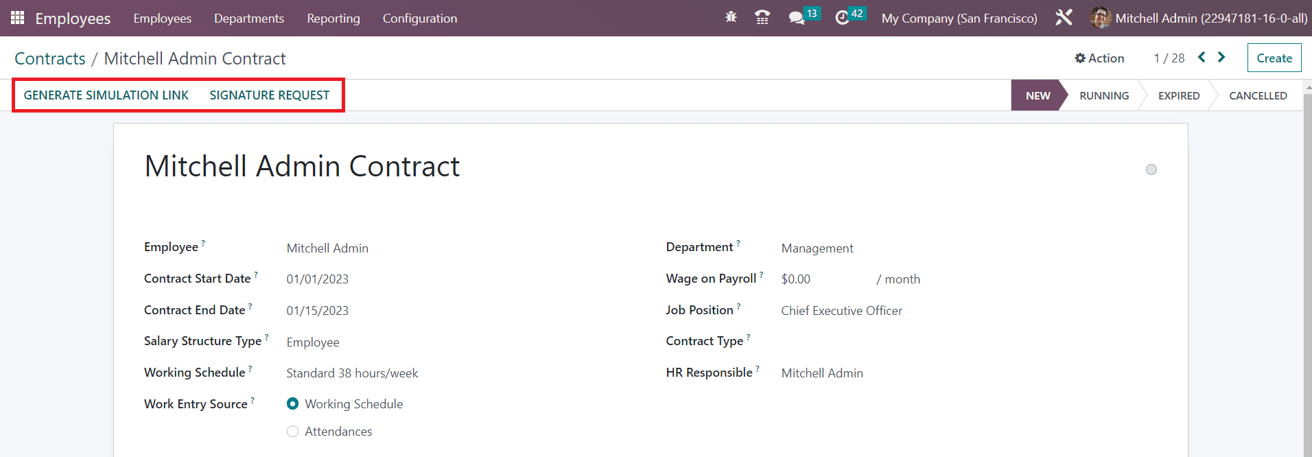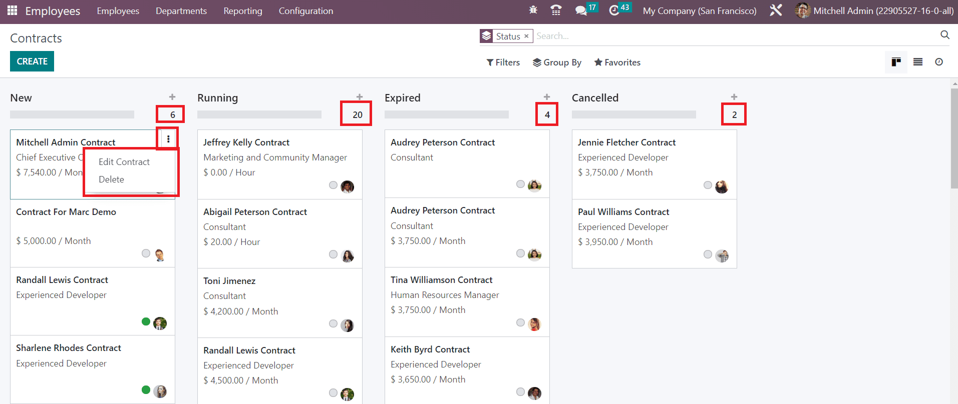 The total number of contracts under each stage can be viewed on the top right side of each stage. The three small vertical dots available on each contract can be used to Edit and Delete the respective contract. You can use Running, Not Running, Change of Occupation, Employed, Archived, Late Activities, Today Activities, and Future Activities as Filters. In order to group the contracts, you can use Status, Employee, Start Date, Job Position, Working Schedule, and Salary Structure Type.