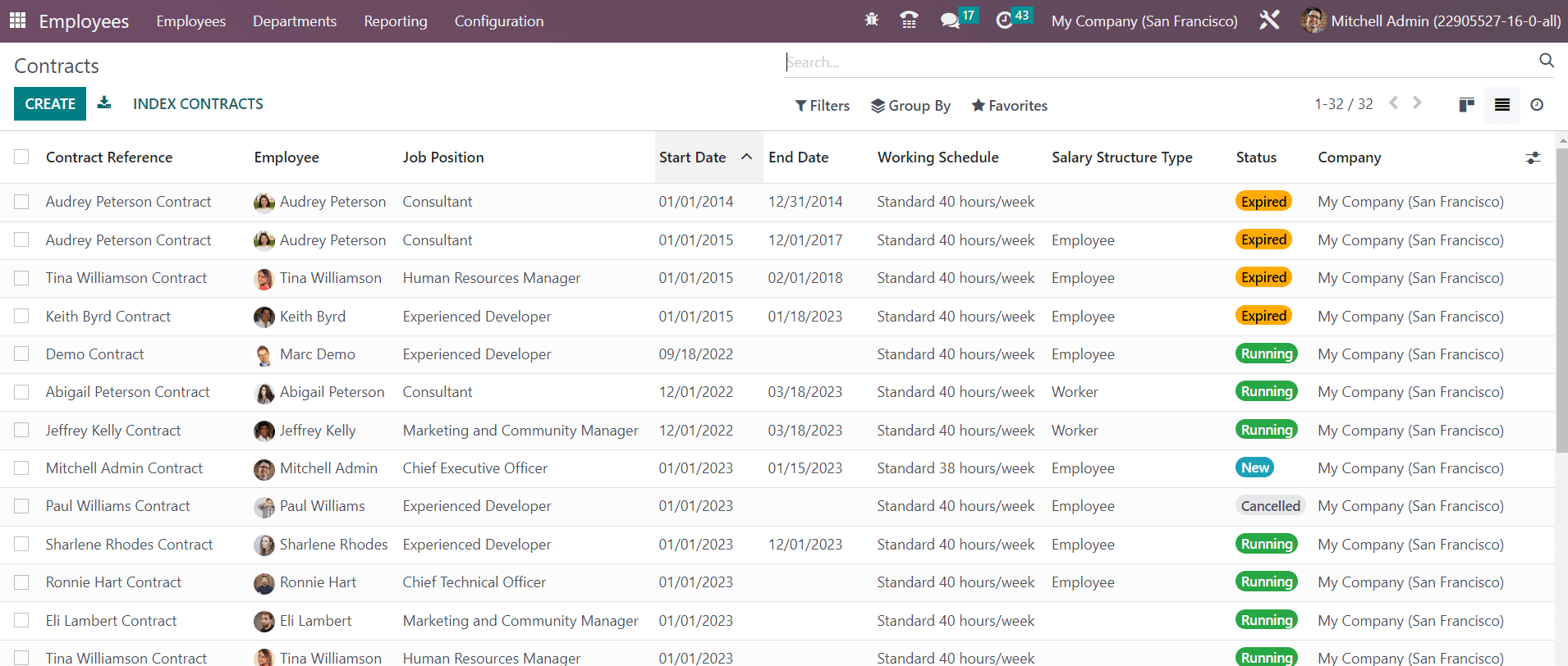 The list view of the Contracts shows the Contract Reference, Employee, Job Position, Start Date, End Date, Working Schedule, Salary Structure Type, Status, and Company. Now, click on the Create button to create a new contract.