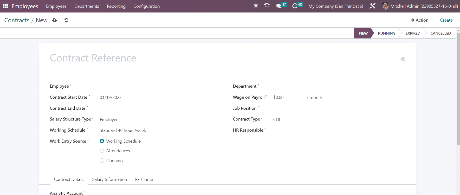 As a contract reference, you can add a title to the contract. Mention the Contract Start Date, Contract End Date, Salary Structure Type, Working Schedule, Department, Wage on Payroll, Job Position, Contract Type, and HR Responsible in the corresponding fields. The Work Entry Source will define the source for work entries generation. The work entries can be generated from Working Schedule, Attendance, or Planning.