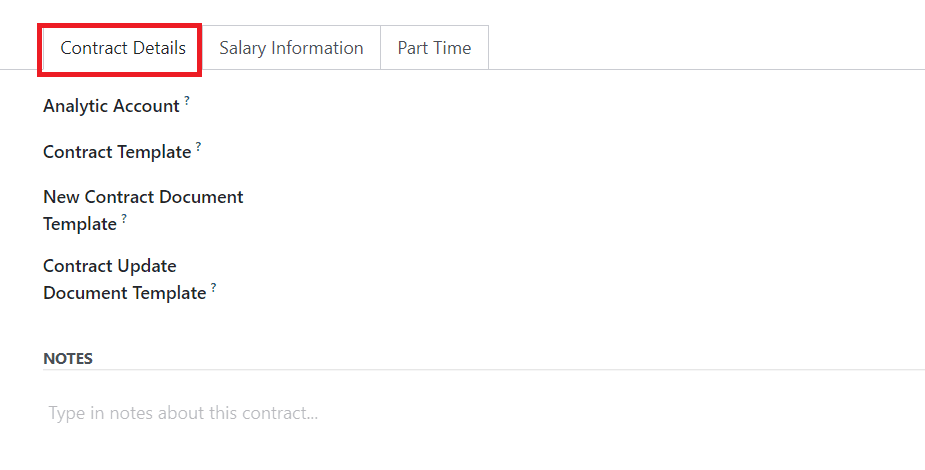 Under the Contract Detail tab, you can mention the Analytic Account. The default template used when making an offer to an applicant can be specified in the Contract Template field. The default document that the applicant will have to sign to accept a contract offer can be specified in the New Contract Document Template field. The Contract Update Document Template indicates the default document that the employee will have to sign to update the contract. The Notes field can be used to add notes about this contract.