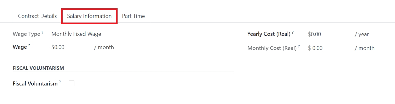Select the Wage Type and set the monthly gross Wage of the employee under the Salary Information tab. The total real yearly and monthly cost of the employee for the employer can be obtained from the respective fields. Activating Fiscal Voluntarism will voluntarily increase the withholding tax rate. You will get an additional field to mention the Fiscal Voluntary Rate.