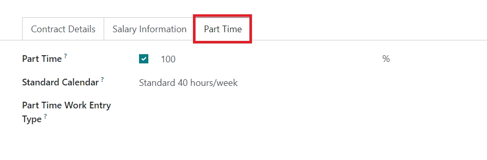 Under the Part Time, you will get the Part-Time option to activate for the contract for part-time employees. Set the Standard Calendar to compute the part-time percentage of the employee. The work entry type used when generating work entries to fit the full-time working schedule can be mentioned in the Part-Time Work Entry Type field.