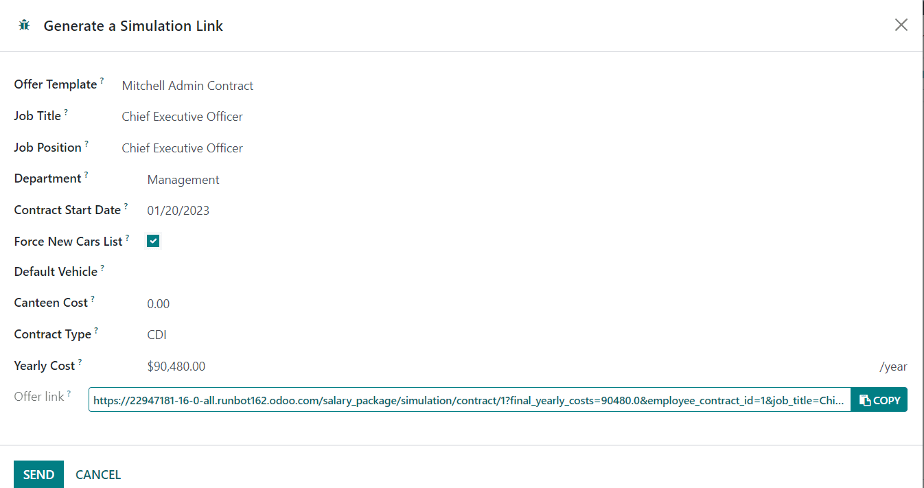 Here, you will get the details of the Offer Template, Job Title, Job Position, Department, Canteen Cost, Contract Type, and Yearly Cost. By activating the Force New Cars List, the employee will be able to choose a new car even if the maximum number of used cars available is reached. The Default Vehicle indicates the default employee’s company car. The Offer Link will be available in the pop-up window. You can click on the Send button to send to the respective employee.