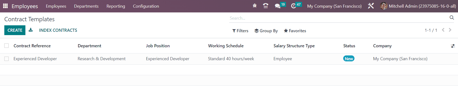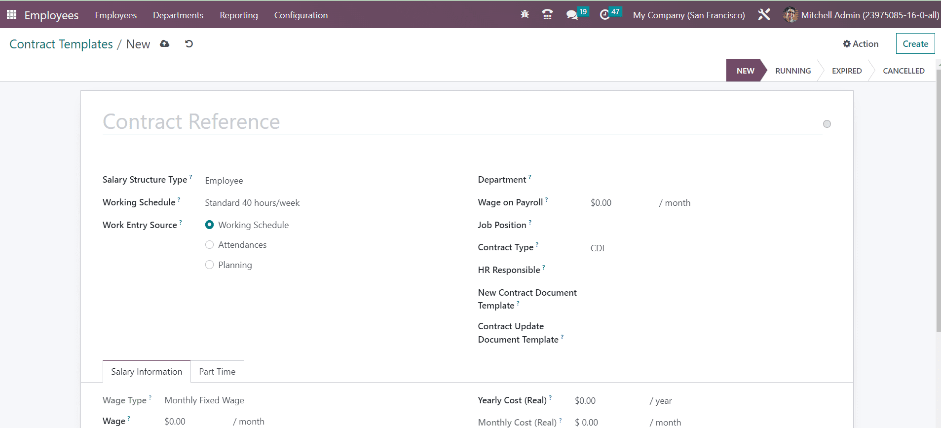 The preview of the Contract Templates encompasses the details of the Contract Reference, Department, Job Position, Working Schedule, Salary Structure Type, Status, and Company. Let’s check how to create a new template for the contract. You can use the Create button to get a new form just as shown below.