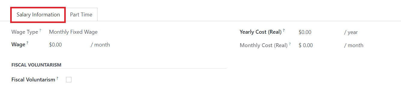 Under the Salary Information tab, you can add the Wage Type, Wage (Employee’s monthly gross wage), Yearly Cost (Total real yearly cost of the employee for the employer), and Monthly Cost (Total real monthly cost of the employee for the employer). Activating Fiscal Voluntarism will voluntarily increase the withholding tax rate. You will get an additional field to mention the Fiscal Voluntary Rate.