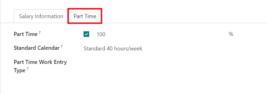 The Part Time tab can be used to activate the Part Time option if you are creating this contract template for a part-time job. By activating this option, you will get separate fields to specify the Standard Calendar and Part Time Work Entry Type. Once you complete the configuration of the contract template, you can use them for new employees.