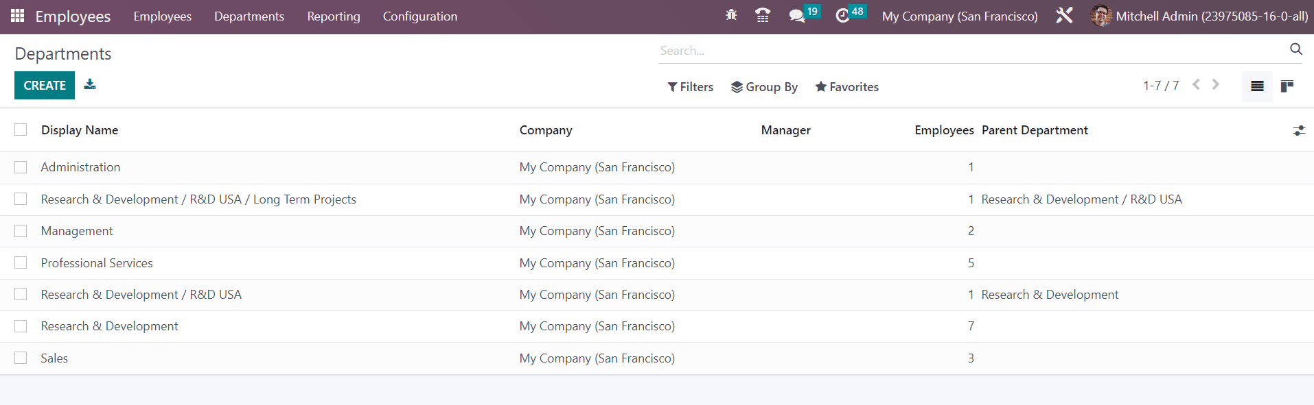 You will get the Display Name, Company, Manager, Number of Employees, and Parent Department details from this list view. Now, click the Create button to configure a new department.