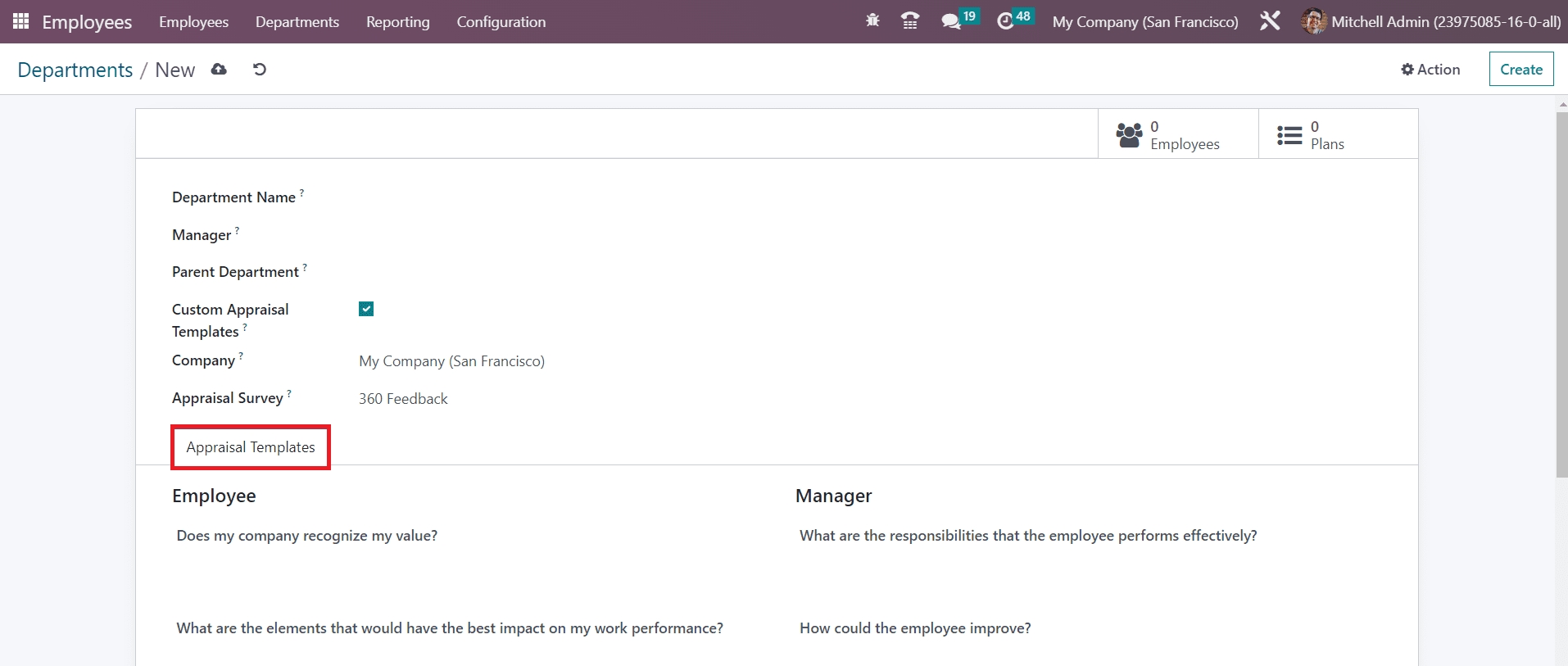 In the respective fields, you can mention the Department Name, Manager, and Parent Department. Activate the Custom Appraisal Templates if you want to customize an appraisal template for this department. As soon as you enable this option, you will get an additional tab called Appraisal Templates, where you can create a new appraisal template. The name of the Company will be automatically shown in the respective field. Specify the Appraisal Survey, which is used as a default survey template related to this department. After creating the record of the department, you will get the Employees smart button to observe the employees under this department and the Plans smart button to manage various plans for this department.