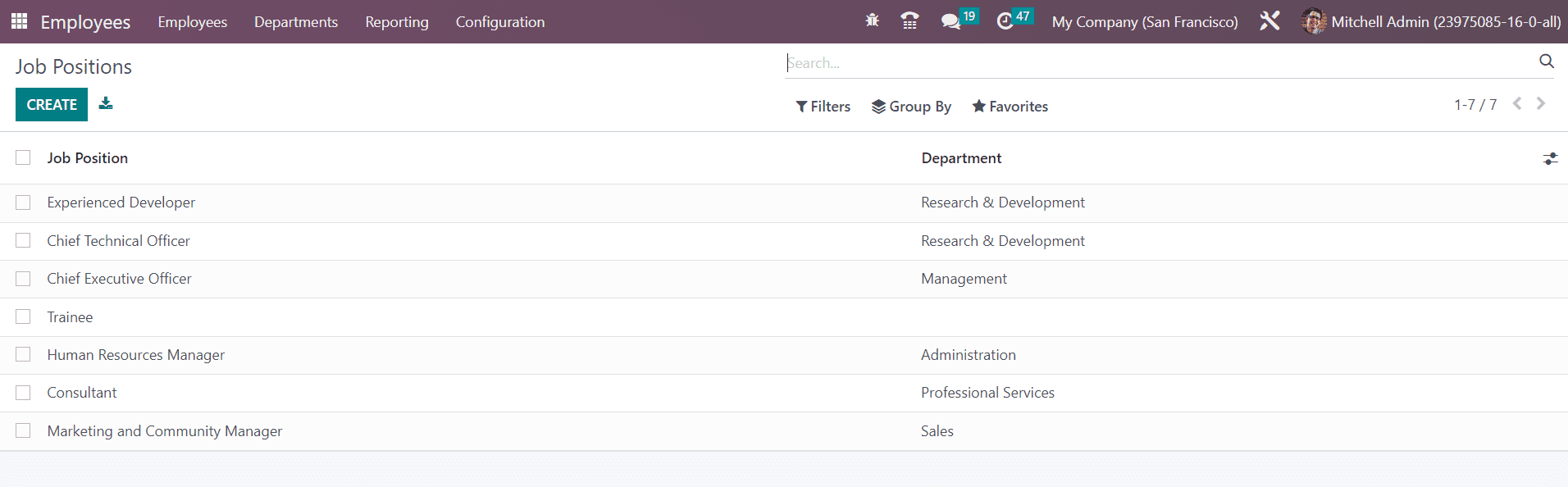 Here, you can see the list of pre-configured job positions. Use the Create button to configure new job positions.