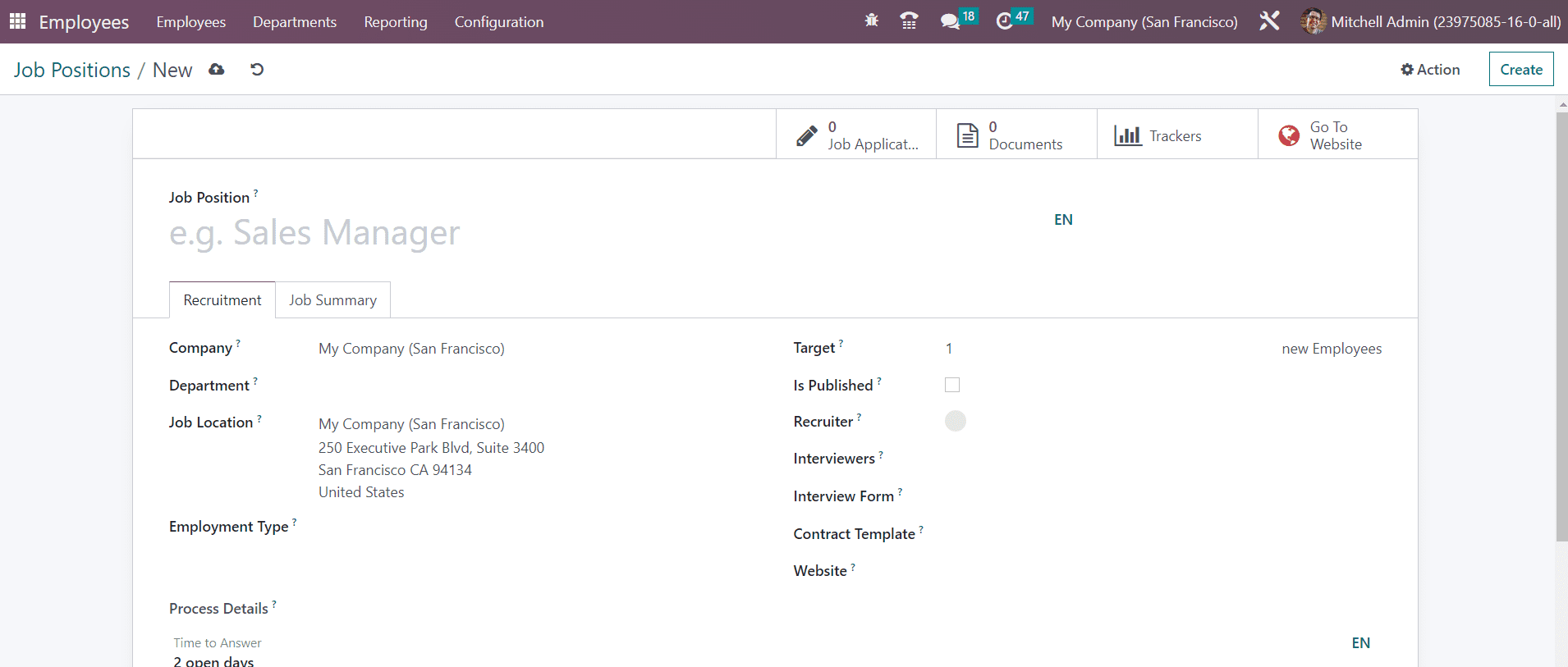 Odoo will open a new form view as shown above where you can configure the details of the new Job Position. After mentioning the Job Positions, you can add information in the Recruitment tab.