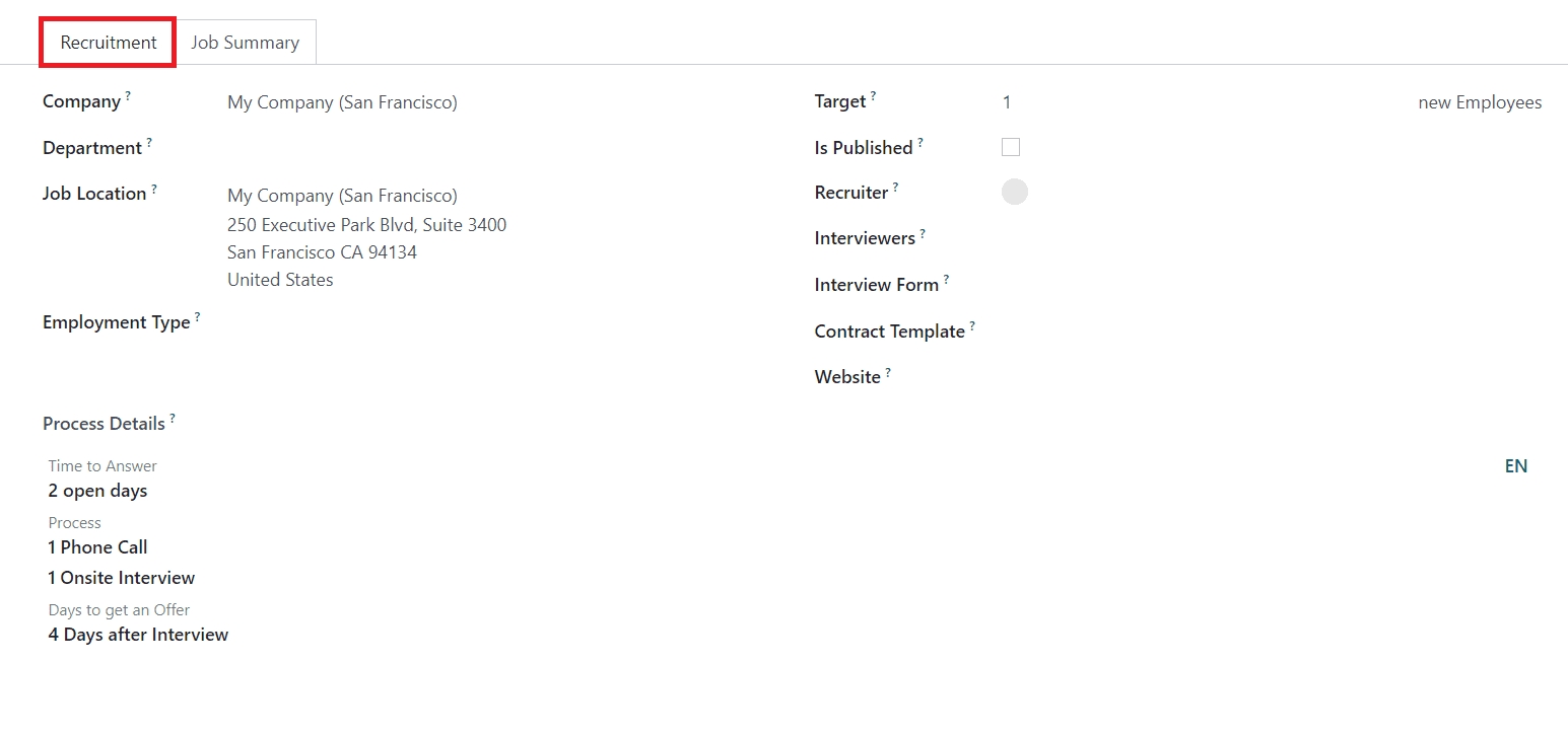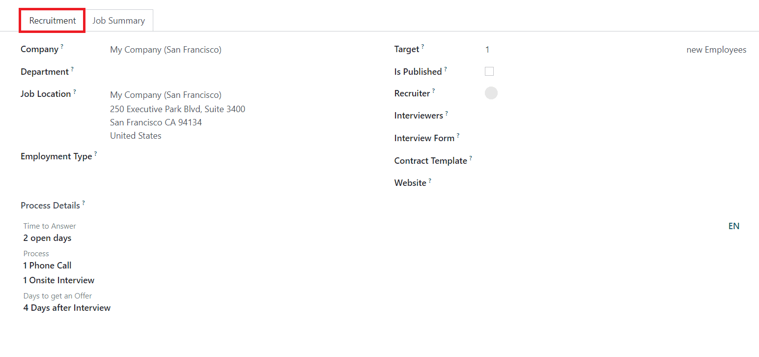 These details will be used for the operations of recruitment for this job position. Specify the Company, Department, Job Location, and Employment Type details in the respective fields. The complementary information that will appear on the job submission page can be specified in the Process Details section. It includes the Time to Answer, Process, and Days to Get and Offer details. The number of employees you expect to recruit for this particular job position can be mentioned in the Target field. Set the Is Published field, if the application is already published on the website of the company. Additionally, you can add Recruiter, Interviewer, Interview Form, Contract Template, and Website in the respective fields.