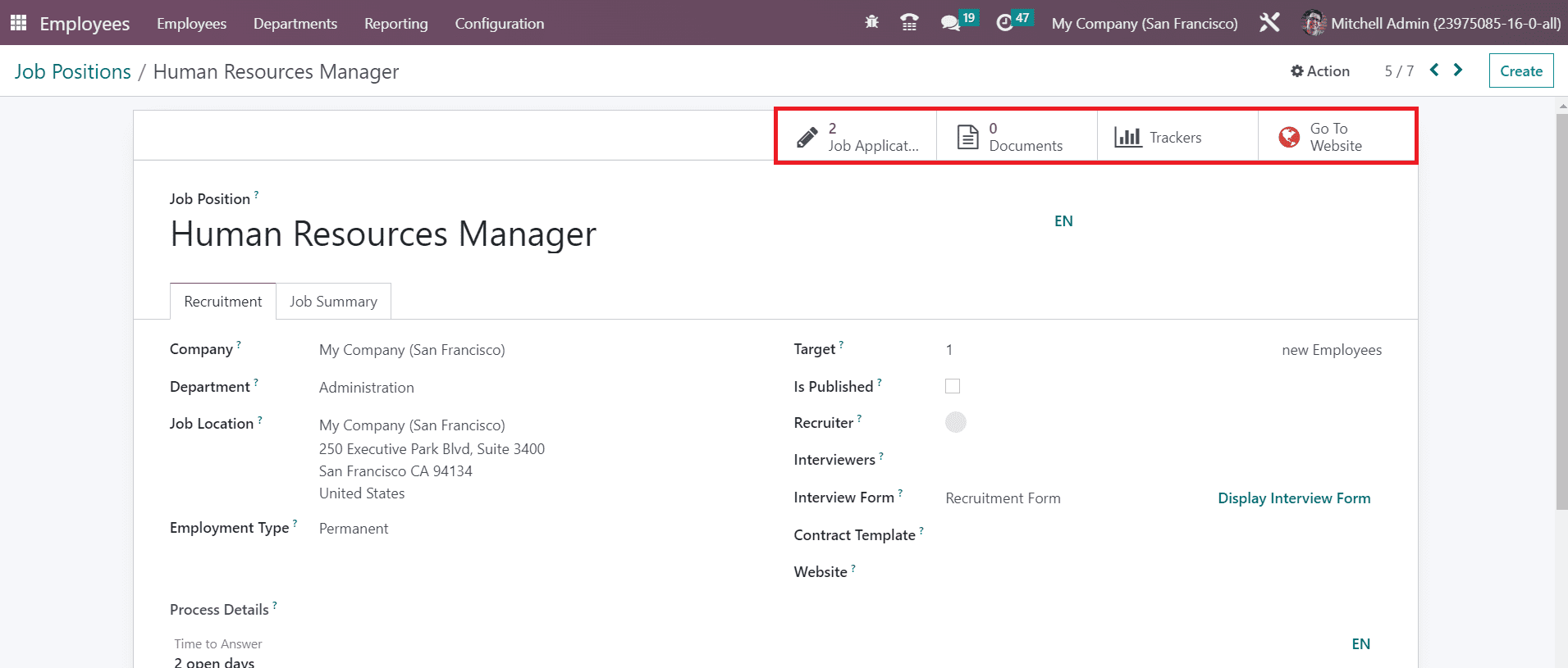 All applications for this particular job position from various sources can be managed using the Job Applications smart button. The Documents button will display the documents related to this job position. The Trackers will show various job sources.