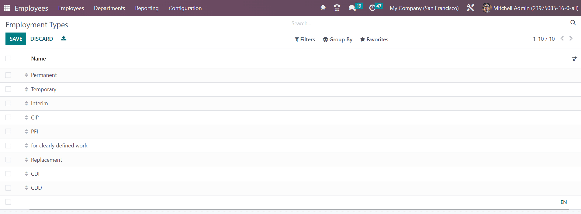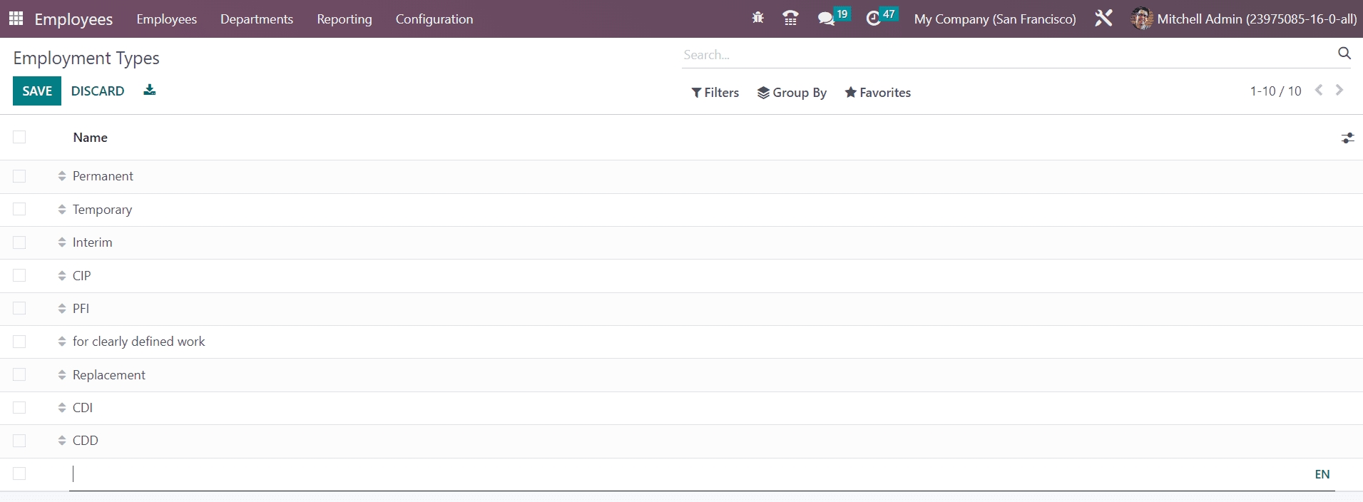 You can easily create Employment Types using the Create button. You need to mention the Employment Type in the given line and click on the Save button.