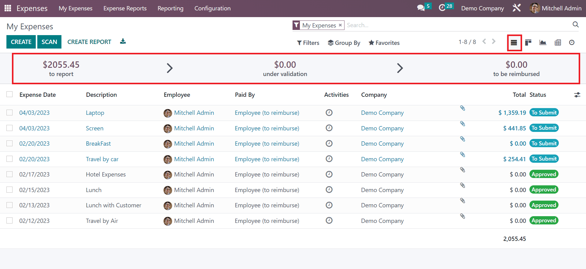 You can access the dashboard of the expense module once choosing the My Expenses menu inside the My Expenses tab. The record of already submitted expenses is accessible to a user in the My Expenses window. In the List view, we can obtain the data related to expenses, including Expense date, Employee, Company, Status, Description, Activity, and more. At the window top, you can see expenses to report, reimbursed amount, and under validation cost. A clear portrait of expense status is viewable to a user after viewing the report.