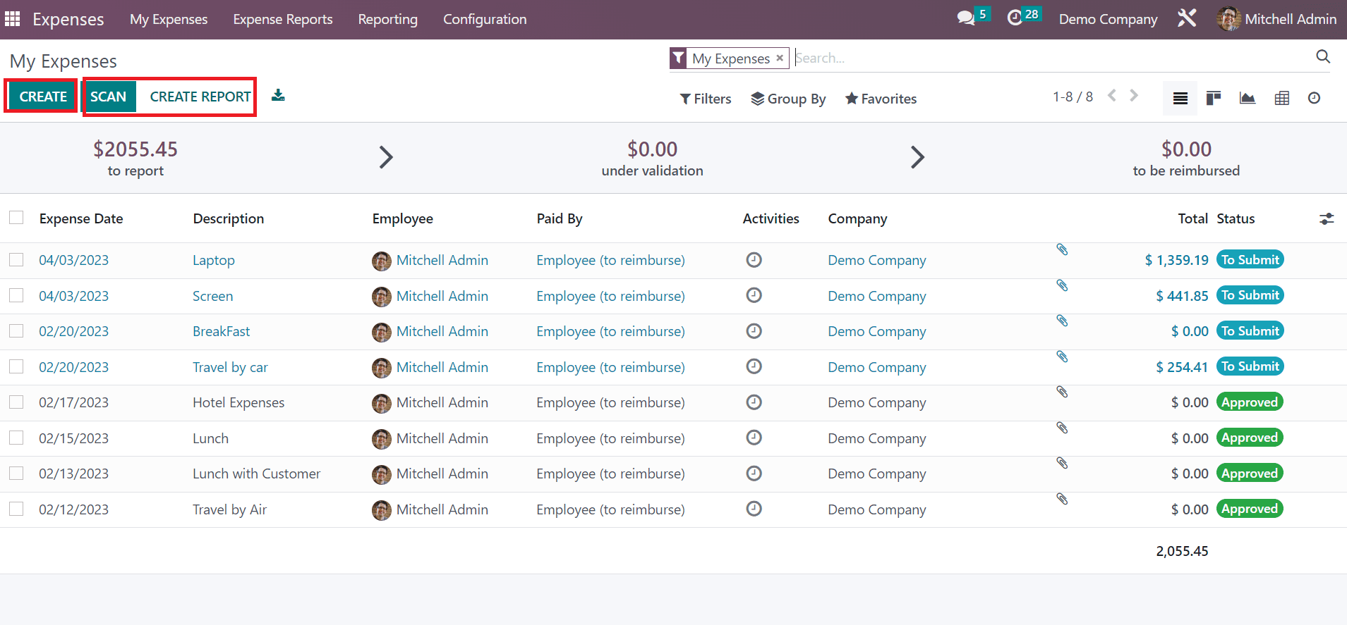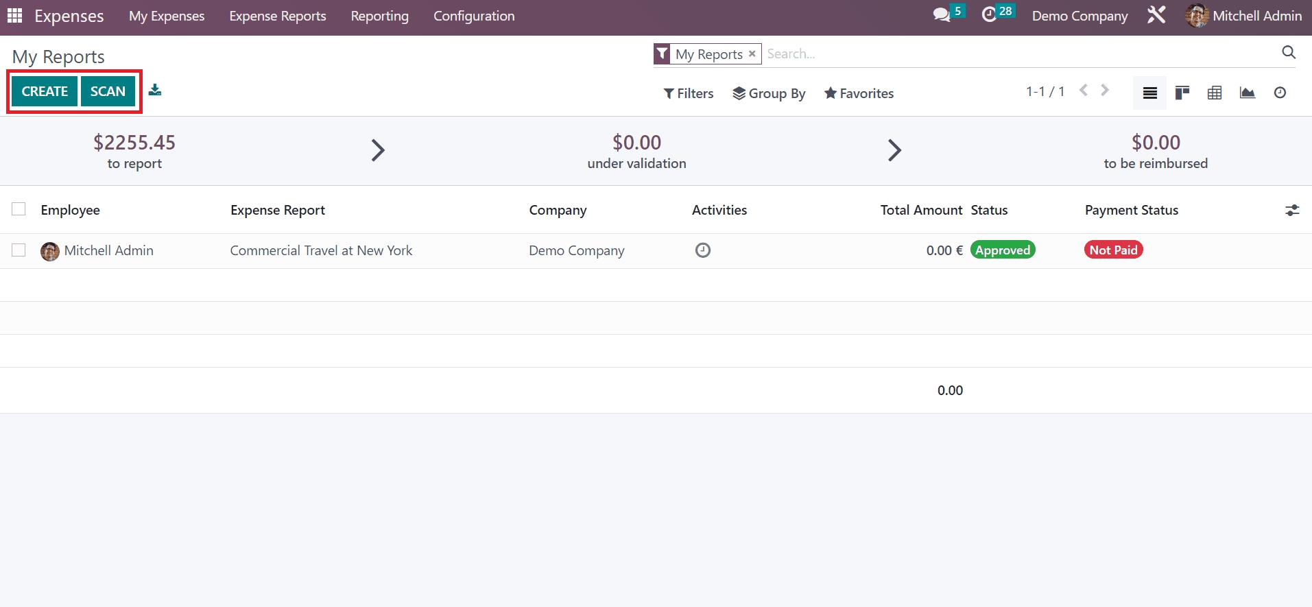 Below the My Expenses tab, you can obtain the My Reports menu, and all existing reports are viewable to the user. Each minute detail of reports such as Employee, Activities, Payment Status, Expense Report, Company, and more are displayed to the user. By choosing the SCAN icon, you can quickly upload report data to Odoo 16. It is simple to describe a new report once selecting the CREATE icon.