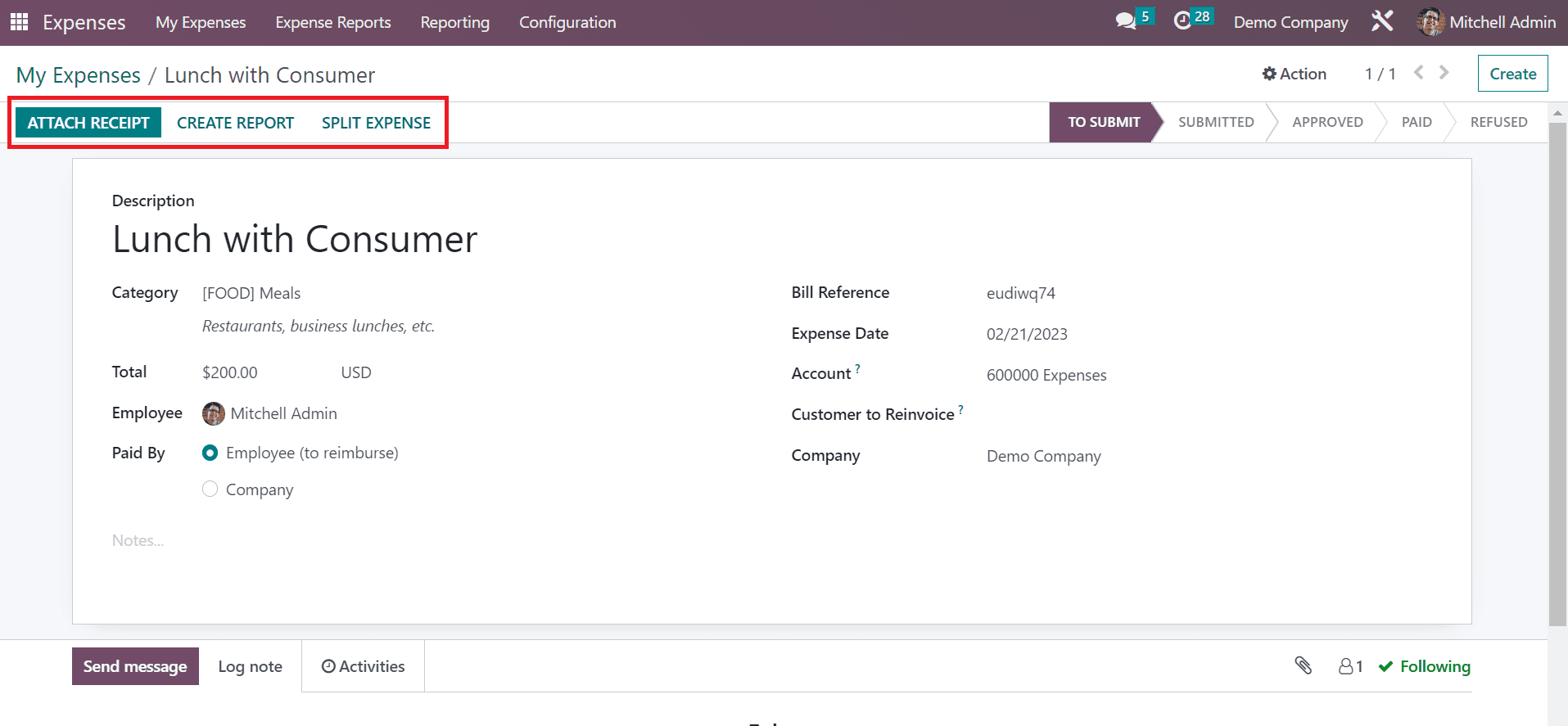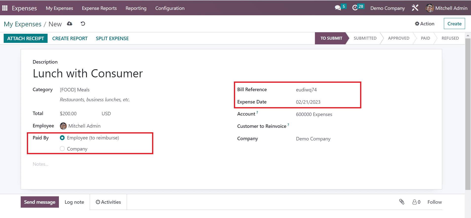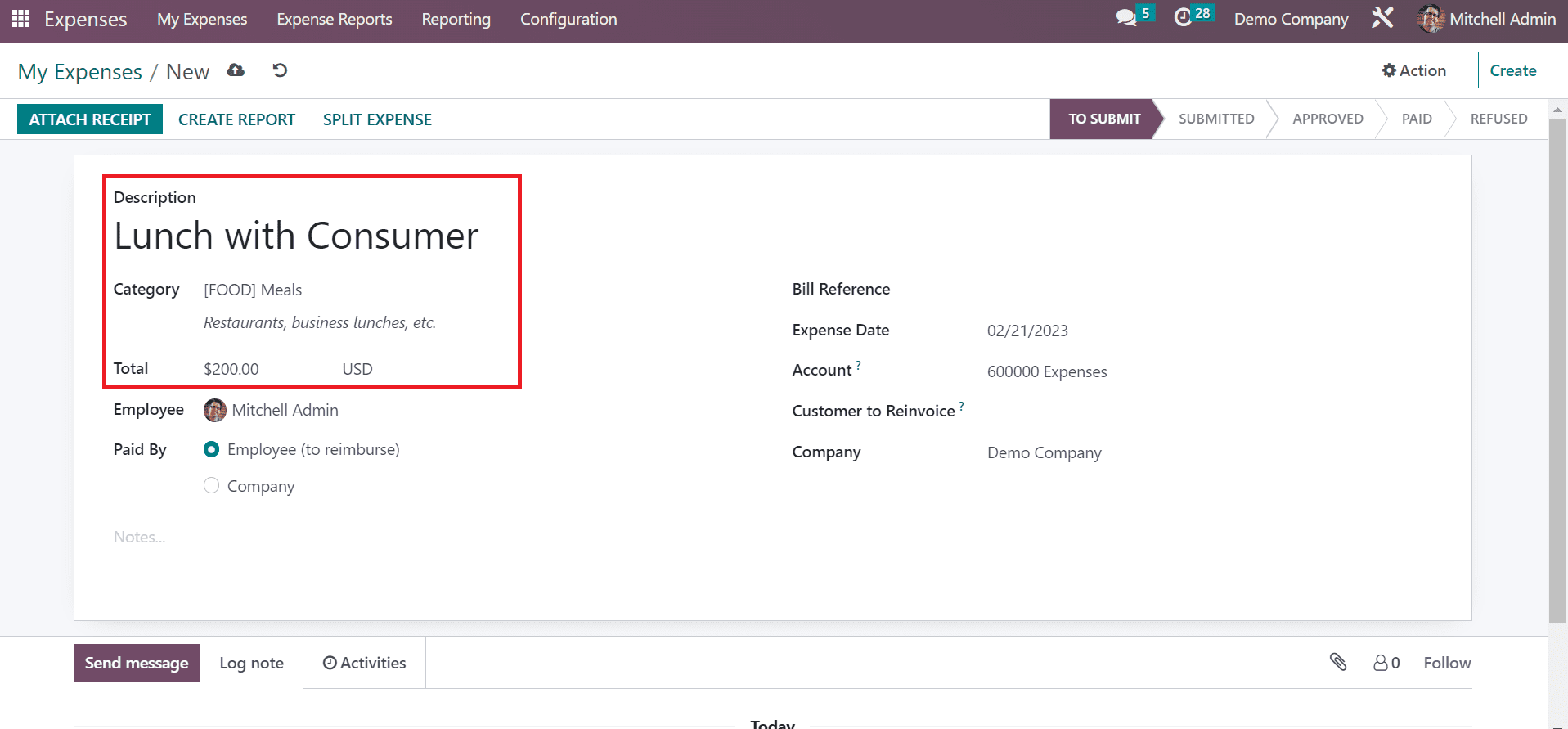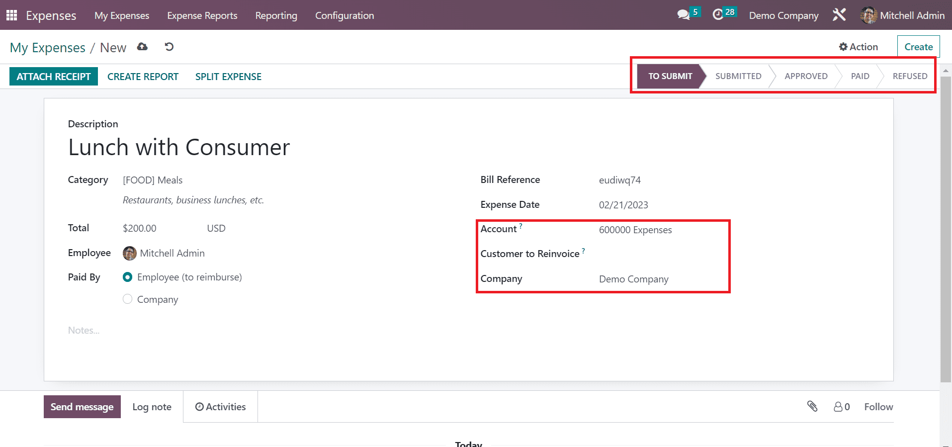 You can choose the expected expense account in the Account option. Furthermore, we can select the category for customers to invoice and the company name. Each piece of information is saved automatically in the Odoo 16. You can also put the expense in various stages like TO SUBMIT, APPROVED, REFUSED, SUBMITTED, and PAID.