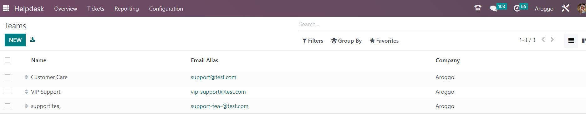 Already configured help desk teams can be observed here. The preview of the list includes the Name, Email Alias, and Company. You can use the New button to create a new help desk team.