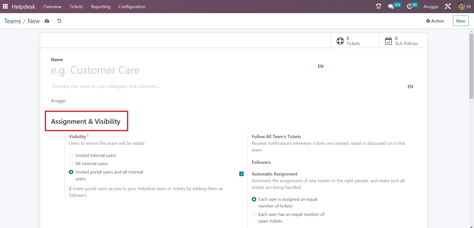 The form view of the Team creation window is shown above. Here, you can provide the name of the team in the given space. After mentioning the name of the team, you can add one tow line to describe this team to your colleagues and customers. Specify the name of the company in the given space. The Assignment & Visibility tab can be used to define the visibility of the team. Here, you can decide the people to whom this helpdesk team and its tickets will be visible. You can set the visibility to Invited internal users, All internal users, or Invited portal users and all internal. In the Followers field, you can mention the followers of this team so that they will receive notifications whenever tickets are created, rated, or discussed in this team. By activating the Automatic Assignment, you can automate the assignment of new tickets to the right people, and make sure all tickets are being handled. Here, you will get two options to decide the method of assignment such as Each user is assigned an equal number of tickets and Each user has an equal number of open tickets.
