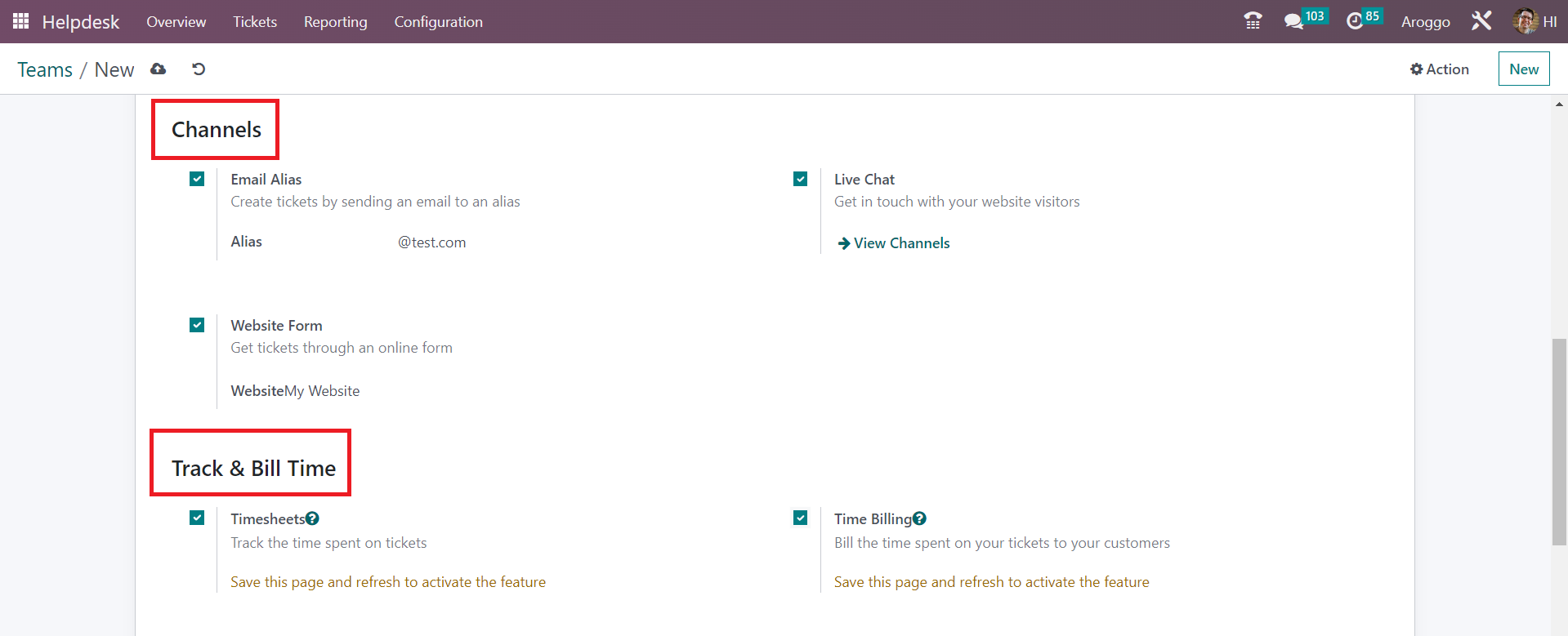By activating the Timesheets option, you can track the time spent on tickets. Here, you can mention a project to which the timesheet of this helpdesk team’s tickets will be linked. In order to bill the time spent on your tickets to the respective customer, you can enable the Time Billing option from the Track & Bill Time tab.