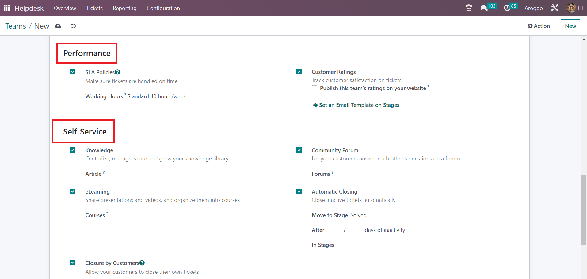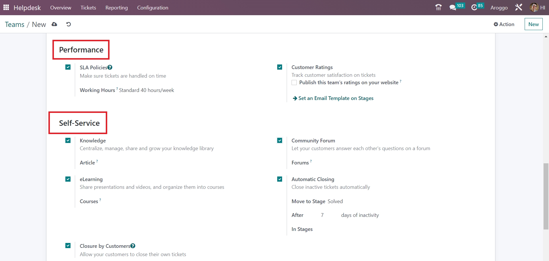 You can use the Knowledge feature to centralize, manage, share, and grow your knowledge library. Set an Article in the given field on which the customer will land by default and to which the search will be restricted. The eLearning option can be activated to share presentations and videos and organize them into courses. The courses can be mentioned in the given space. You can let your customers answer each other's questions on a forum by activating the Community Forum option. You will get a space to mention the Forums in this window. Activate the Automatic Closing option to close the inactive tickets automatically. By activating this option, you will get a space to mention the stage to which the closed tickets will be moved. You can also mention days of inactivity here so that Odoo will automatically close tickets after the mentioned days of inactivity. Activating the Closure by Customer option will allow your customers to close their own tickets.
